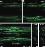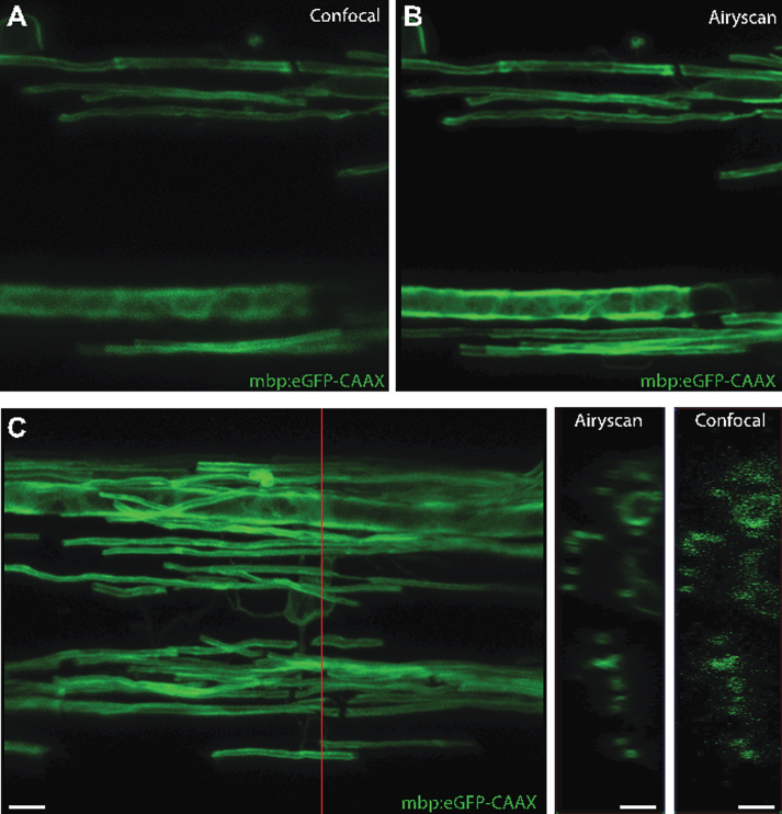 Fig.5. Confocal super-resolution imaging. A+B are images of the stable transgenic reporter mbp:eGFP-CAAX, which labels myelin sheaths, taken in confocal (A) and Airyscan (B) modes. A clear improvement in resolution in the X-Y plan is observed. C indicates improvement in z-axis resolution in Airyscan mode. The red line indicates the position where the Y-Z projections on the right were taken. Definitive circular rings of myelin membrane are observable in the Airyscan mode. Scale barsâ=â5 μm. |