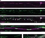 Fig.6. Transgenic tool to visualize myelin along individual axons in vivo. A fluorescent fusion of GFP with the GPI anchored axonal protein contactin1a can be expressed in individual neurons together with a fluorescent protein that labels the entire cell, e.g. Tandem dimer (Td) Tomato (A). Gaps in GFP-Cntn1a localisation along axons (A+B) correspond to the locations of myelin sheaths, as shown in (C) where all myelin is labelled using the sox10:mRFP reporter. Scale bars: Aâ=â20 μm, B+Câ=â5 μm. |
