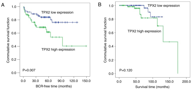 Figure 2. High TPX2 expression is associated with poor prognosis in patients with PCa. (A) Kaplan-Meier analysis of the BCR time of patients with PCa with high TPX2 expression levels was shorter compared with those with low TPX2 expression levels (P=0.007). (B) The overall survival time of patients with PCa was not associated with TPX2 expression levels (P=0.120). TPX2, Targeting protein for Xenopus kinesin-like protein 2; PCa, prostate cancer; BCR, biochemical recurrence-free time.