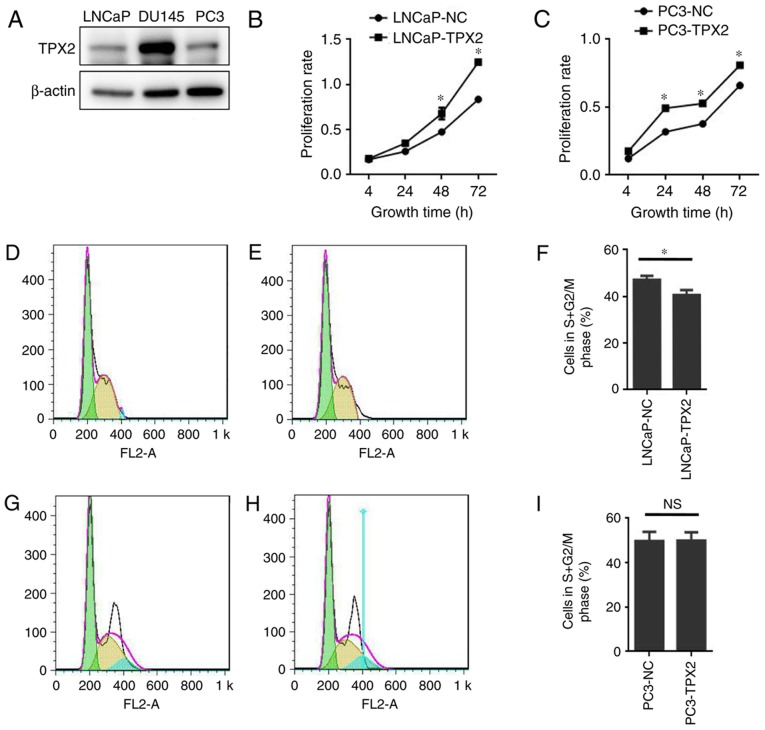 Figure 3. TPX2 expression and function in prostate tumor cell lines. (A) Western blotting detected TPX2 protein expression in PCa cell lines. TPX2 was highly expressed in the DU145 cell line, while expressed at low levels in the PC3 and LNCaP cell lines. The CCK8 assay indicated that the overexpression of TPX2 in (B) LNCaP and (C) PC3 cells promoted the proliferation rate of PCa cells compared with the control group. The flow cytometry assay conducted in (D) LNCaP-NC and (E) LNCaP-TPX2 cells suggested that TPX2 inhibited cell cycle transit from G0/G1 to S/M phase in LNCaP-TPX2 cells. (F) The average proportion of cells in S+G2 phase was 40.607±2.172 in the LNCaP-TPX2 group, while it was 47.09±1.804 in the LNCaP-NC group (P=0.016). (G) PC3-NC and (H) PC3-TPX2 cells were also examined using flow cytometry. (I) No significant difference in PC3 cells was observed (P>0.05). TPX2, Targeting protein for Xenopus kinesin-like protein 2; PCa, prostate cancer; NC, negative control; NS, not significant. *P<0.05.