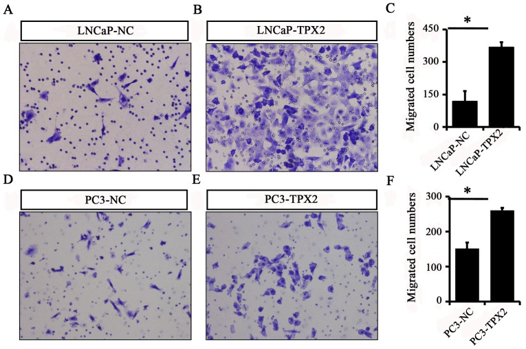 Figure 5. Overexpression of TPX2 promotes the migration of LNCaP and PC3 cells. A Transwell assay was used to detect migration in (A) LNCaP-NC and (B) LNCaP-TPX2 cells. (C) The migration cell number in LNCaP-TPX2 group was 366.7±24.44, while it was 117.3±48.39 in LNCaP-NC group (P=0.022). A Transwell assay was also performed in (D) PC3-NC and (E) PC3-TPX2 cells. (F) The migration cell number in PC3-TPX2 group was increased compared with the PC3-NC group (260.0±8.0 vs. 150.7±18.04; P=0.041). Magnification of all images, Ã400. TPX2, Targeting protein for Xenopus kinesin-like protein 2; PCa, prostate cancer; NC, negative control. *P<0.05.