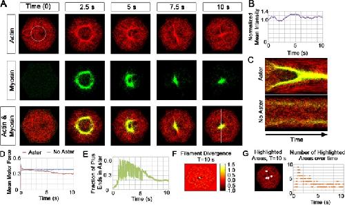 Fig 3. Actomyosin arrays remodel in simulated dense networks.(A) Sequence of images from a simulated time lapse of 1,000 actin filaments (red) and 5,000 myosin motors (green). (B) The normalized actin mean intensity (purple) within a region in A (circle at 0 s). The mean intensity is based on identifying the location of an aster within a region of interest (ROI; in this case a circle), and tracking the intensity in that ROI over time. (C) Kymograph at top show formation of an aster over 10 seconds (line in A at 10 s). Kymograph below shows a case where the filament turnover rate is high (p2, 5/s) and no asters are formed. (D) The mean motor exerted force quickly peaks and subsides in cases where asters form (pN, red) but remain constants for cases where no asters form (blue). We have compared the mean motor force for 10 simulations with the standard parameter set and observe that the profiles are similar (S2 Fig) (E) The 'connectedness' of filament plus-ends shown over the length of simulation. (F) The divergence of filaments at the conclusion of a simulation generating an aster; high divergence (yellow region in the center) indicates where filament polarity reverses. (G) Our coarse-grained image analysis technique shows highlighted hexagonal areas within the larger domain at 10 s (S4 Video). We quantified the number of the highlighted areas over time (orange). Additional calculations, including a comparison between the image analysis of filament intensity mappings versus divergence mappings are in the supplementary material (S3 Fig). |