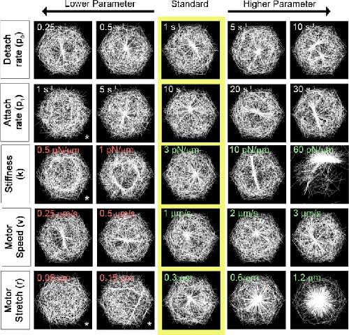 Fig 5. Diverse actomyosin arrays can be formed by discrete changes in motors dynamics.Steady state F-actin morphology after 10 time steps as myosin II biophysics is altered. The yellow box indicates the same set of standard parameters but random initial configuration. Each row depicts morphology generated by changes in a single parameter controlling myosin II motors, ordered from lower value on the left to higher value on the right. Each simulation starts with randomly oriented and positioned filaments and motors. Red numbers represent values outside of the physiological determined range, green numbers are values within physiological range, and white represent numbers whose ranges are best guess values. Rates of motor attachment (p1) and detachment (p0) are estimated. See S1 Table for additional parameters. We have included an asterisk (*) to note cases where an aster has not formed. To determine if an aster could form if given enough time, we ran these simulations for longer time and present results in S5 Fig. |