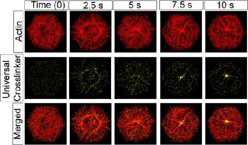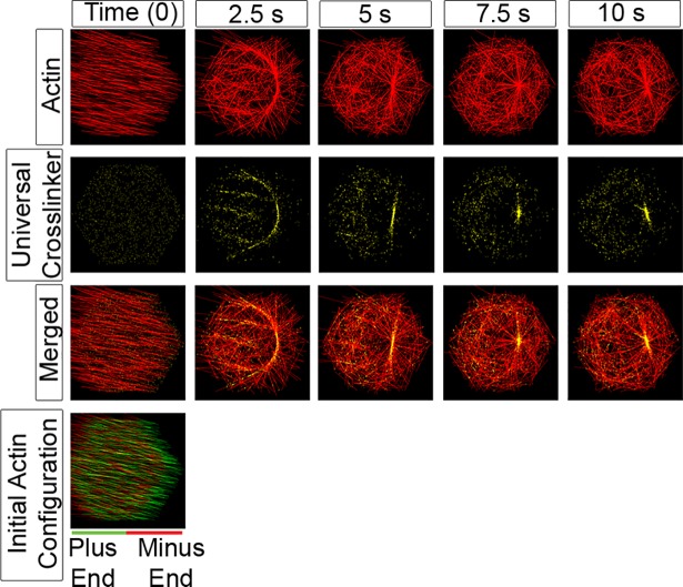Fig 8. Generic actin cross-linkers slow but do not prevent aster formation.Time-evolution of filaments (red), actin cross-linkers (yellow; 1,250) and motors (3,750, not shown) show cross linkers do not inhibit formation of asters. Cross-linkers bind at the same rate as motors (p0) to filament pairs that are oriented within 22.5° (π/8) of each other and no more than 40 nm apart. The cross linkers bind to the shortest distance between candidate filament pairs, and remain fixed. The merged images in the bottom row show the formation of an aster over the time course. Biophysical parameters guiding filaments and motors in these simulations are the standard set (see S1 Table for details). |