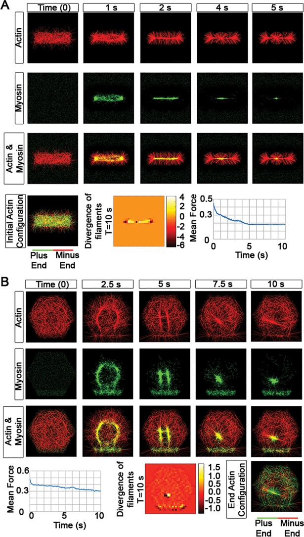 Fig 7. Simulating dynamics of actomyosin networks reconstituted on patterned substrates.(A) Time-evolution of asters formed near a fixed “bar” of actin. The simulation begins with 50% of filaments located entirely inside the bar and 50% of filaments with their minus ends on the bar and plus or barbed ends outside the bar. The density of filaments and motors are the same as previous simulations (1,000 filaments and 5,000 motors). Motors are initially distributed over the entire domain (bar and non-bar). Over time, the motors bind to the filaments and traffic towards filament plus-ends, accumulating within the bar. Abundant motors then contract the F-actin network into an aster. We note: to recreate conditions in the reconstitution studies, filaments in this simulation are stabilized against depolymerization and do not turnover. (B) Time-evolution of asters near tethered motors after a fraction of motors are “tethered” to the bottom eighth of the hexagon. This means that one leg of each motor located in the bottom eighth of the hexagon is fixed in place, leaving the remaining leg free to bind filaments. The freely diffusing motor population interacts with filaments throughout the hexagonal domain. Over time, the fixed-position motors pull asters toward the domain where they are tethered. |