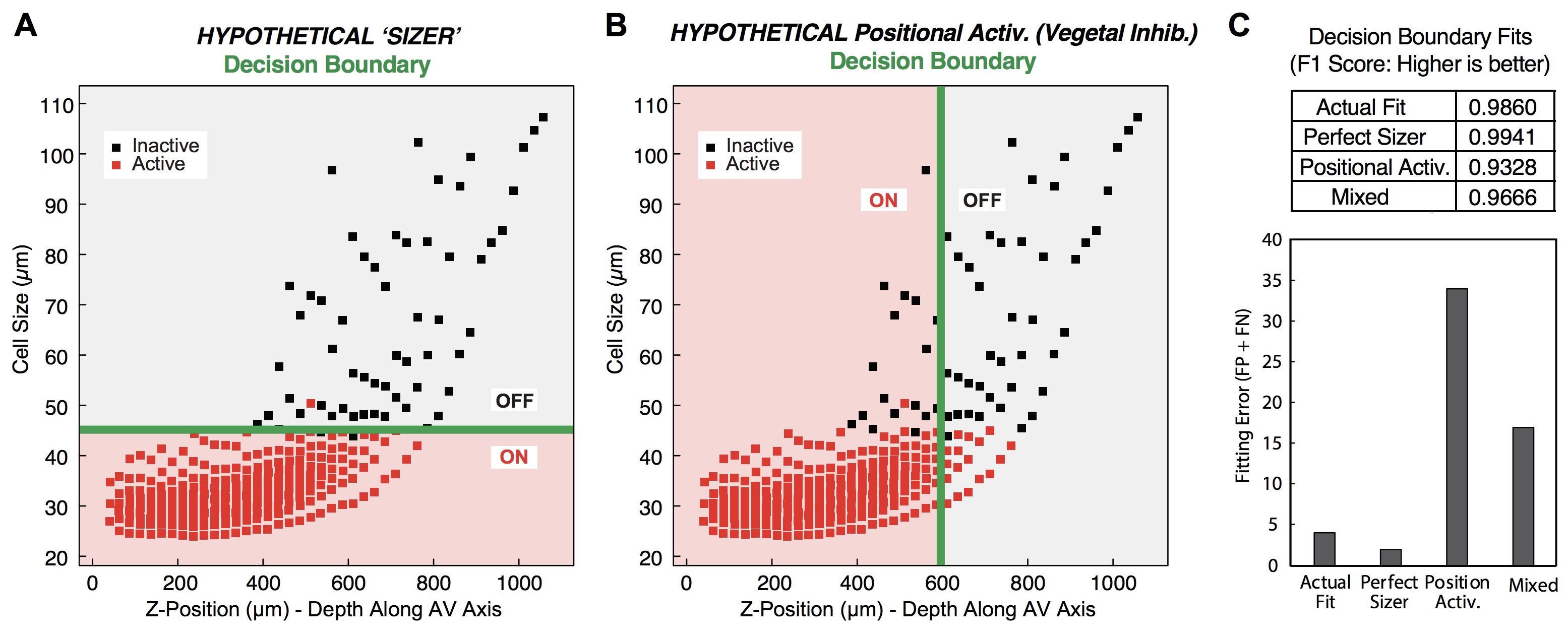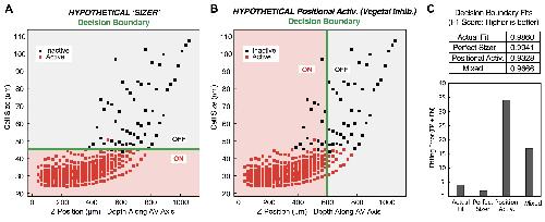 (A-B) Defined boundary decisions for models of ZGA based on a perfect sizer or positional activation.