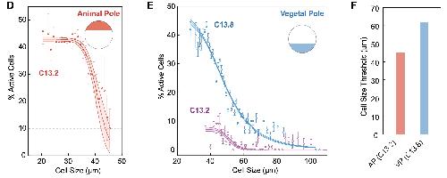 (D and E) EU-RNA accumulation within individual nucleus as a function of cell diameter for animal pole in embryos containing log2 cell no. = 13.2 and vegetal pole in embryos containing log2 cell no. = 13.2 and 13.8. Data binned in 1 µm increments of cell diameter and represented as mean ± 95% CI. Data fit using Hill function, with 95% CI band. Dotted lines indicate 10% of cells being activated.