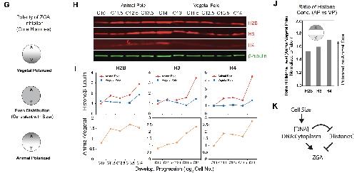 (K) A simple model for ZGA regulation by cell size. During early embryogenesis, cell size is a main physical parameter that reduces dramatically and causes increase of DNA concentration or DNA:cytoplasm ratio in cells, which further titrates transcription repressors - histones. Differential levels of histones in animal pole and vegetal pole sets different cell size threholds for ZGA.