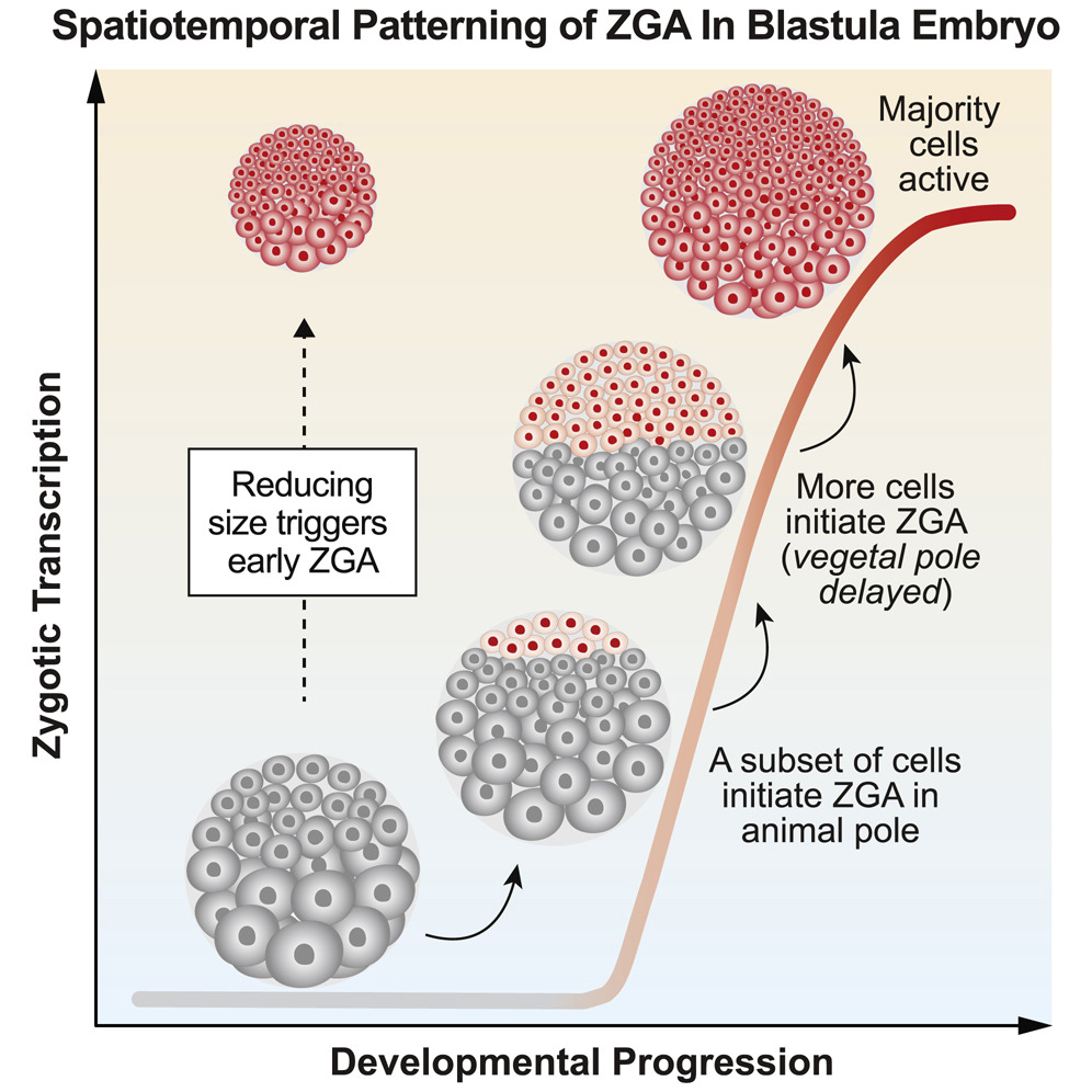 Figure 6. Premature ZGA in Miniature Embryos Rules out a Cell-Cycle Counter Model and Supports a Cell Sizer Model for ZGA.