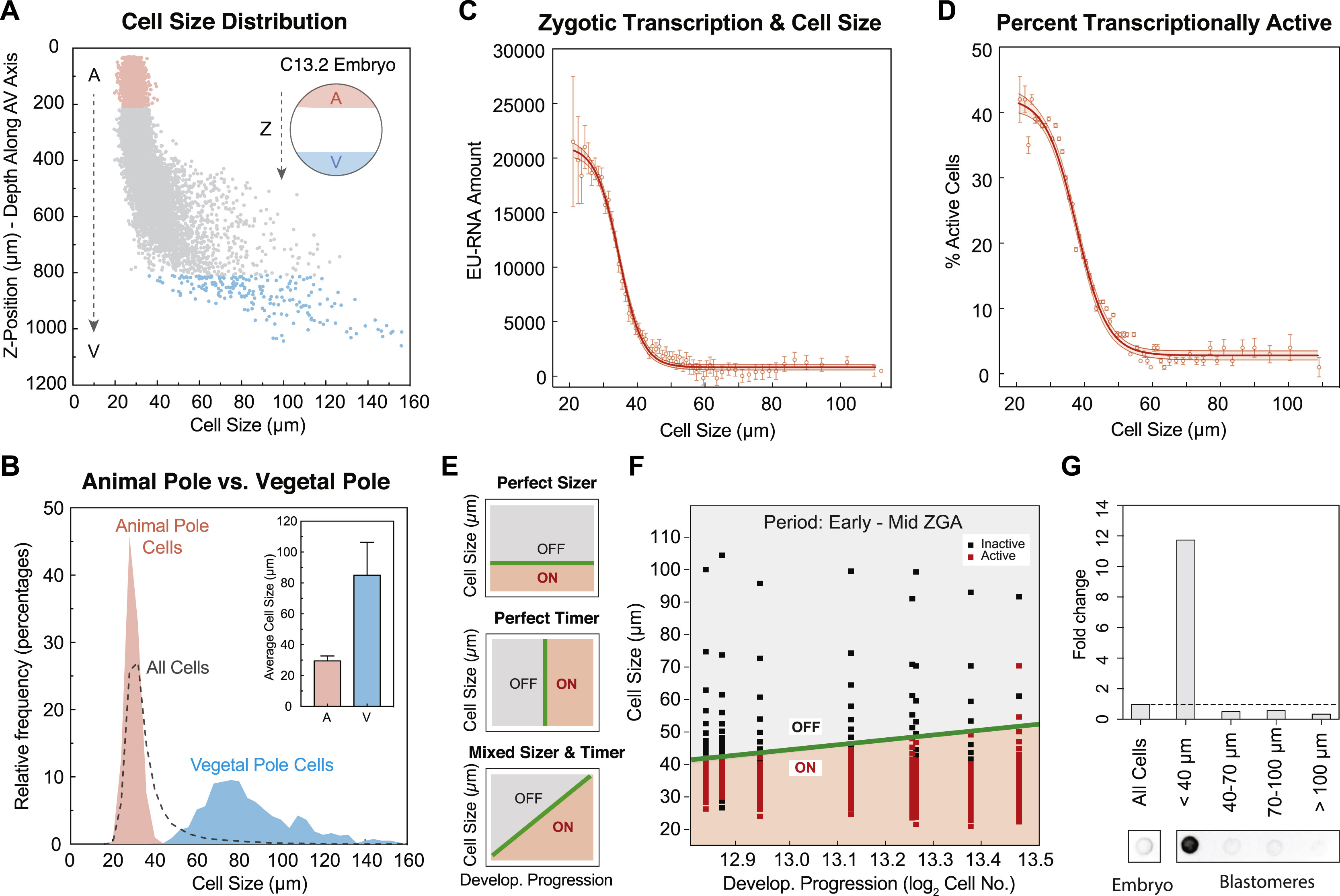 (F) Cell size threshold for transcription at the animal and vegetal pole. We define ZGA initiation for a bin of cells as 10% of cells being activated. Here this occurs at a size threshold of ~ 45 µm at the animal pole and ~ 62 µm at the vegetal pole. Data fit using Hill function, with 95% CI band.
