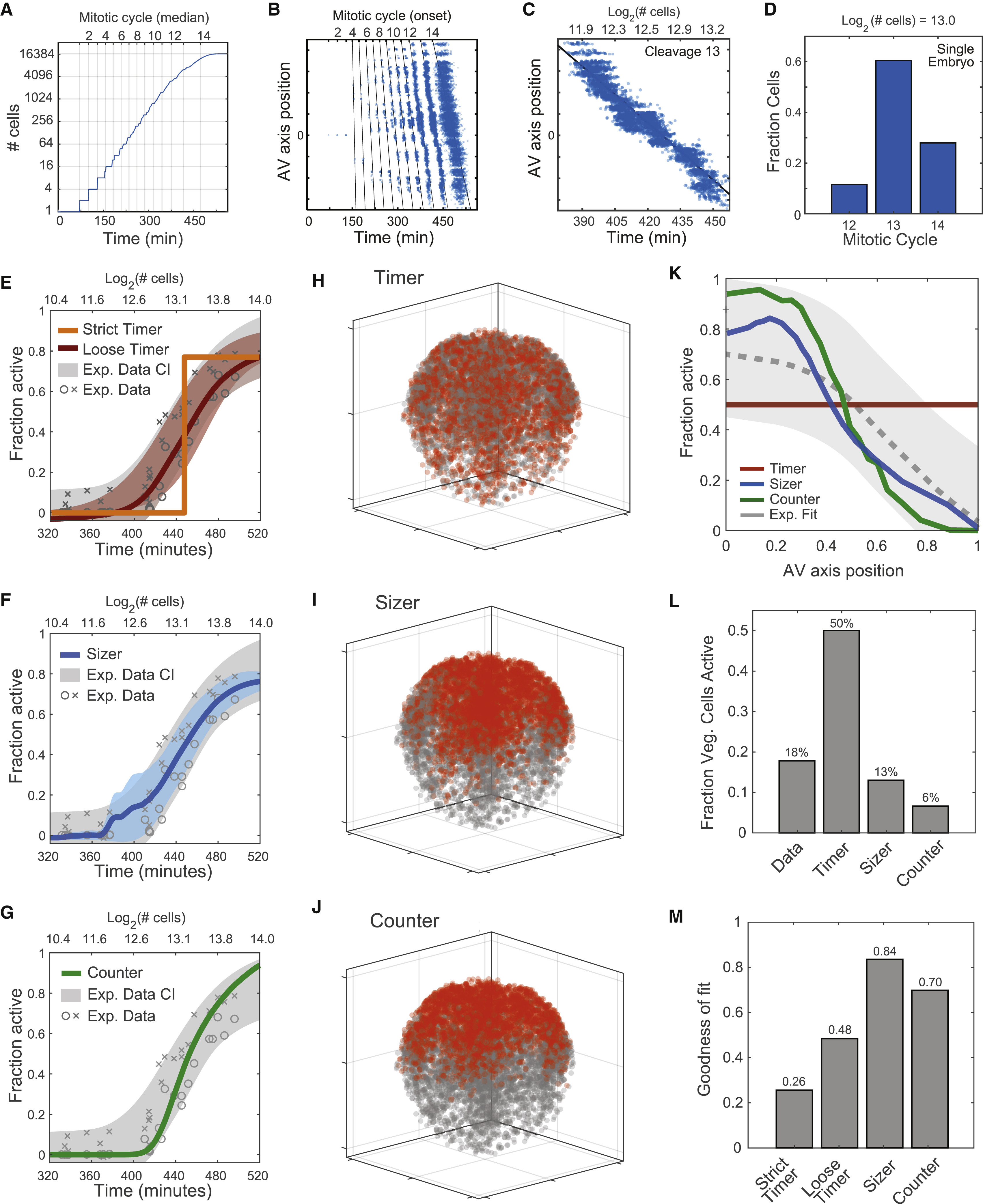 (H–J) Predicted spatial patterns of ZGA for an embryo in early ZGA (∼9,000 cells; log2 = 13.1), based on timer, sizer, and counter models. Activated nuclei (red) and inactive nuclei (gray).