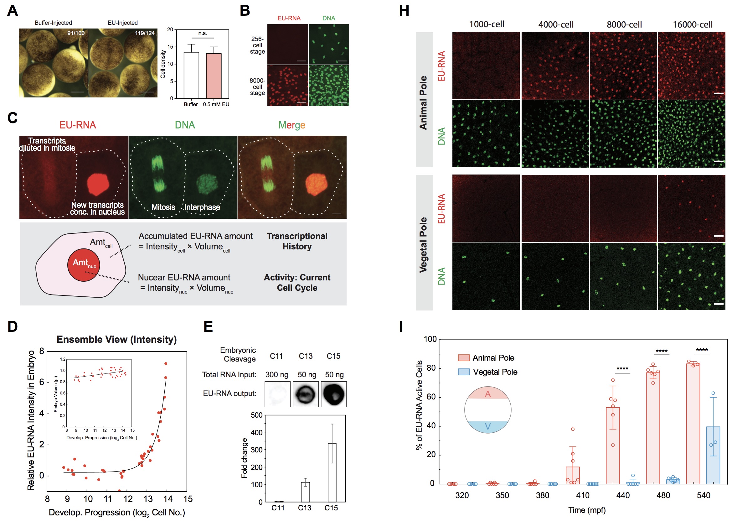 (H) Representative confocal images of EU-RNA (red) and DNA (green) for cells at the animal pole (top panels) and the vegetal pole (bottom panels) in the same embryo at respective cleavage stages. Scale bars, 50 µm.