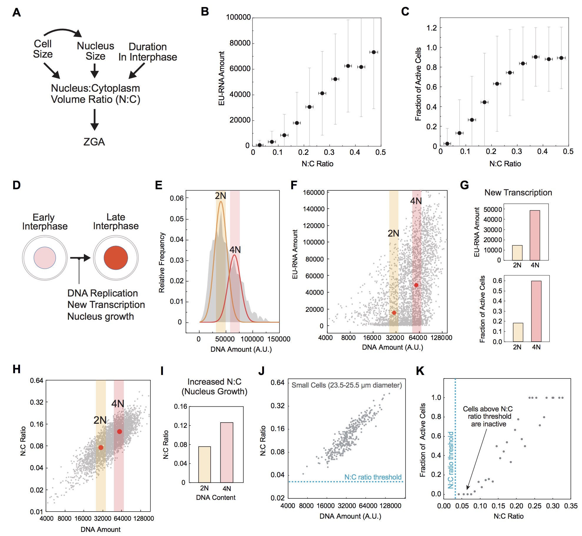 (K) Fraction of transcriptionally active cells as a function of N:C ratio for small cells (23.5-25.5 µm cell diameter). Data were binned in 0.01 increments of N:C ratio. Many cells whose N:C ratio has surpassed the threshold remain inactive.