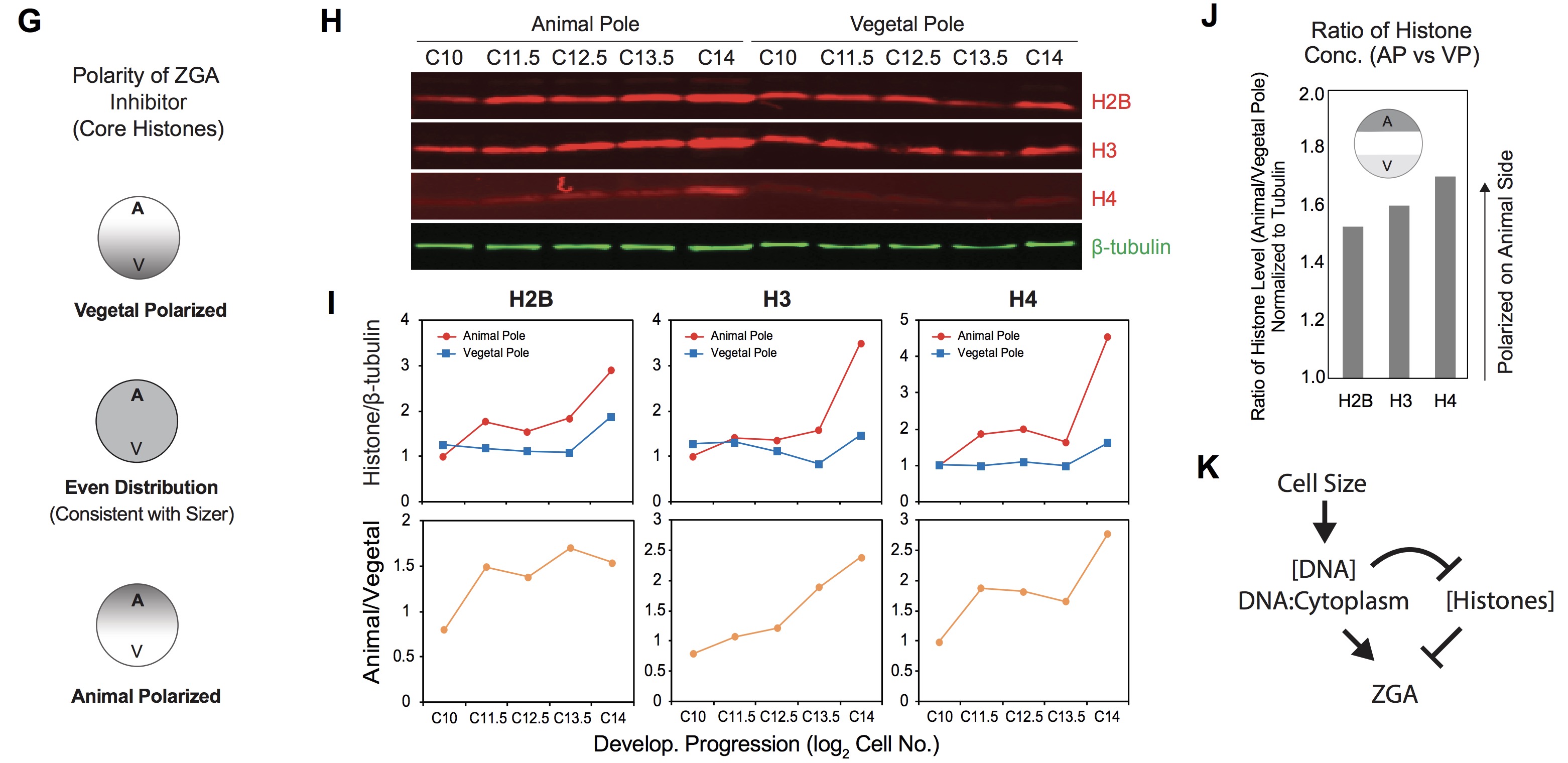 (J) Ratios of histone concentration in AP vs. VP in early to mid ZGA. Average of embryos in early to mid ZGA (log2 cell no. = 12.5-13.5), normalized to tubulin. Shows ~ 1.6-fold higher levels of core histones in animal pole.