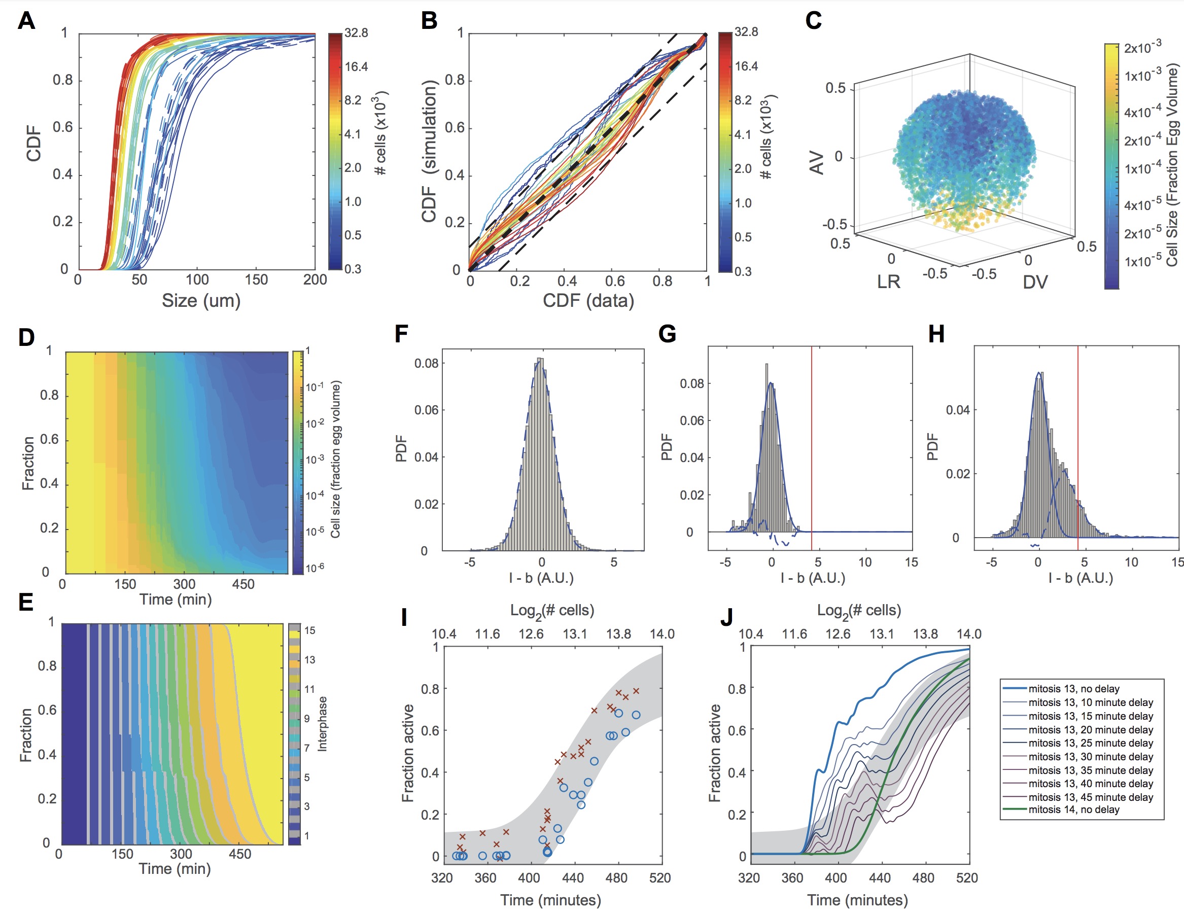 (A) Cumulative distribution functions (CDFs) of cell sizes of 40 measured embryos (solid lines) and simulated embryos