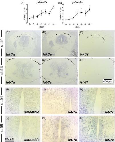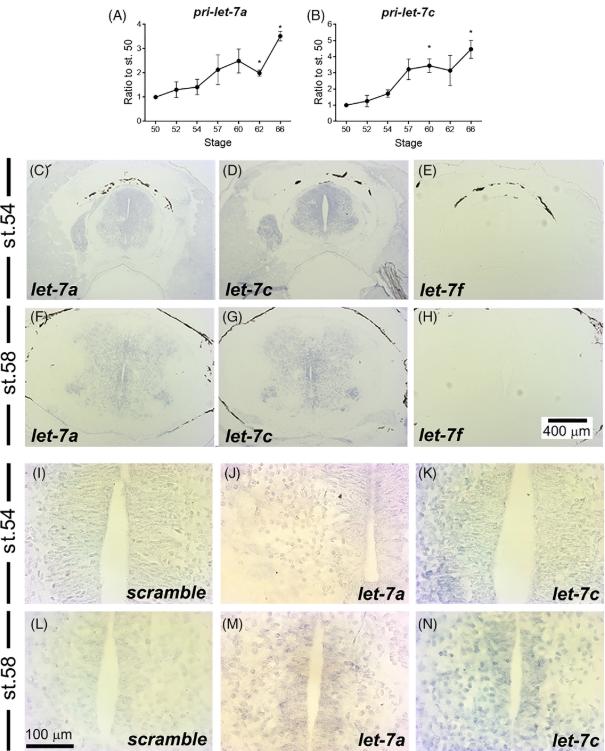 Priâlet7 and letâ7 increase during metamorphosis in the central nervous system. RTâqPCR for priâlet7a (A), priâlet7c (B) in brain RNA samples. Expression was normalized to eef1α and compared to st.50 (yâaxis; averageâ±âSEM, n = 3 independent experiments). *Pâ<â.05, tâtest against hypothetical value = 1 (no change compared to st.50). Tadpoles were fixed at stage 54 (CâE, IâK) and 58 (FâH, LâN) and in situ hybridization was performed in transversal sections of spinal cord. Specific locked nucleic acid (LNA) probes for letâ7a (C, F, J, M), letâ7c (D, G, K, N), and letâ7f (E, H) were used. Scramble LNA probe was used as a control (I, L)