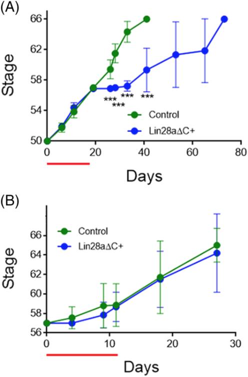 Câterminal domain of Lin28a is not required to delay metamorphosis. A, Metamorphosis progress (stages, yâaxis) of F1 nontransgenic siblings (control, green line) and transgenic animals (lin28a+) with HS from day 0 to day 18 (red bar) starting at st.50 (days, xâaxis). ***Pâ<â.001, unpaired tâtest for days 26, 28, 33, and 41. No significant differences were detected for days 11 and 19. B, Metamorphosis progress (stages, yâaxis) of F1 nontransgenic siblings (control, green line) and transgenic animals (lin28a+, blue line) with HS from day 0 to day 11 (red bar, 2âweeks) starting at st.57 (days, xâaxis). No significant differences were detected for days 9, 11, and 16