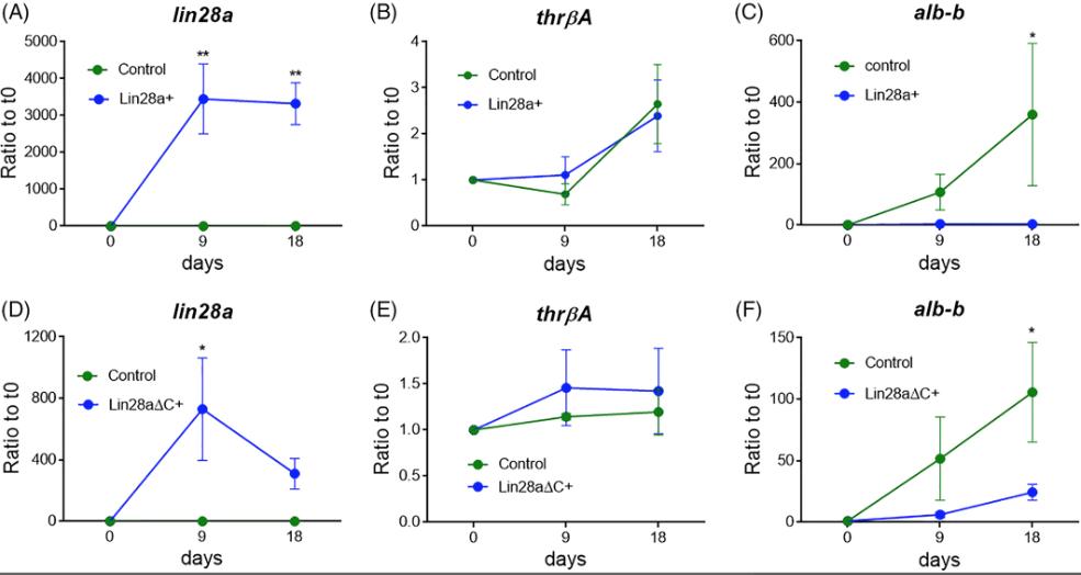 Overexpression of Lin28a delays Xenopus metamorphosis and down-regulates albumin independently of its translational regulation domain.