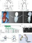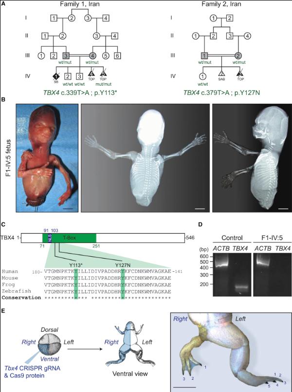 Figure 1 PAPPAS Is Caused by TBX4 Recessive Loss-of-Function Mutations (A) Pedigrees of two consanguineous Iranian families segregating small patella syndrome in heterozygous TBX4 individuals (gray) and posterior amelia with pelvis and pulmonary hypoplasia syndrome (PAPPAS) in homozygous fetuses (black). The identified mutation and the genotype of available family members are indicated in green. Squares, circles, diamonds, and triangles denote males, females, unknown gender individuals, and fetuses, respectively. Open symbols are used for unaffected family members, and deceased individuals are indicated by a diagonal slash through the symbol. Wt, wildtype; mut, mutant; SB, stillbirth; TOP, termination of pregnancy; SAB, spontaneous abortion. (B) Photographs and X-rays of affected fetus IV:5 in Family 1 with a germline homozygous p.Y113X TBX4 mutation. Scale bars: 1 cm. (C) Phylogenetic alignment performed with Clustal O, and position of germline recessive TBX4 mutations in the conserved T-box domain of the transcription factor TBX4. NLS, nuclear localization signal. (D) TBX4 and ACTB RT-PCR analysis on cDNA extracted from forelimb tissues of a control and the F1-IV:5 fetuses indicating complete absence of the endogenous TBX4 transcript in the mutant fetus. bp, base pairs. (E) Xenopus tropicalis crispants show severe hindlimb dysplasia after injection of tbx4_gRNA1 pre-complexed with Cas9 protein in one ventral cell of a four-cell-stage embryo (blue), thereby targeting the ventral lineage unilaterally, i.e. primarily the lateral plate mesoderm and the epidermis. A representative post-metamorphic animal (NF stage 66) injected on the right side is shown; the number of toes is indicated. Scale bar: 0.5 cm, ventral view.