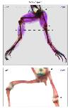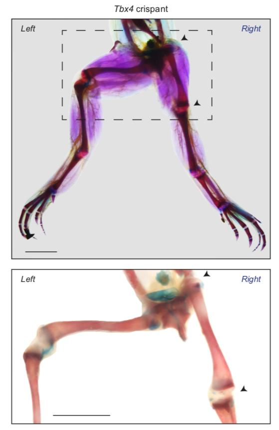 Figure S2: Phenotype of mildly affected Xenopus tropicalis animals. Representative images of an NF stage 66 adult animal, that had been unilaterally/ventrally injected with Tbx4_gRNA2 and Cas9 protein at the 4-cell stage, stained with alizarin red/alcian blue. Note the dislocated joints (black arrowheads) both at the hip and knee, and the shorter femur of the hindlimb in the injected side (right). Scale bars: 0.2 cm.