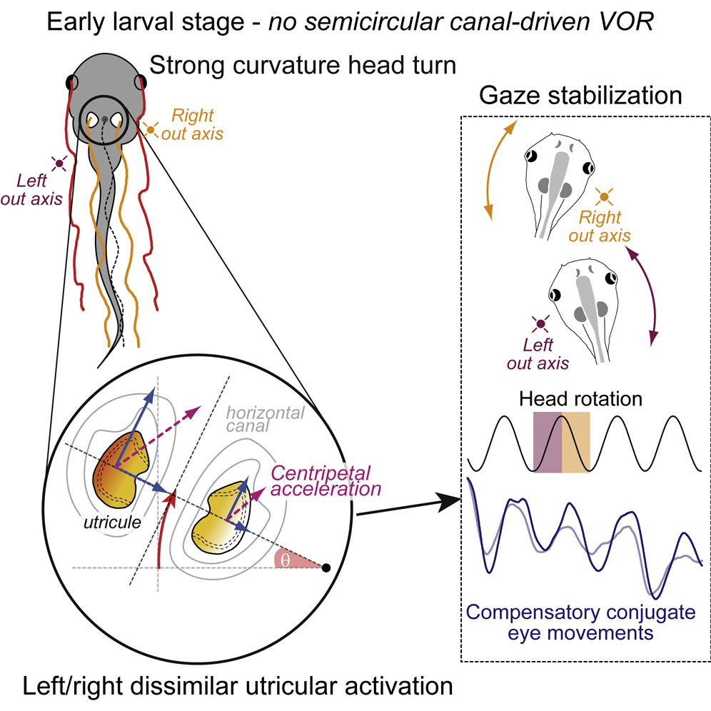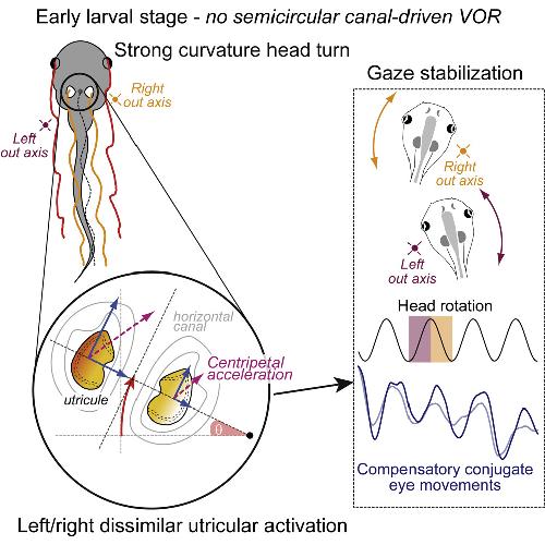 Locomotor maturation requires concurrent gaze stabilization improvement for maintaining visual acuity [1, 2]. The capacity to stabilize gaze, in particular in small aquatic vertebrates where coordinated locomotor activity appears very early, is determined by assembly and functional maturation of inner ear structures and associated sensory-motor circuitries [3-7]. Whereas utriculo-ocular reflexes become functional immediately after hatching [8, 9], semicircular canal-dependent vestibulo-ocular reflexes (VORs) appear later [10]. Thus, small semicircular canals are unable to detect swimming-related head oscillations, despite the fact that corresponding acceleration components are well-suited to trigger an angular VOR [11]. This leaves the utricle as the sole vestibular origin for swimming-related compensatory eye movements [12, 13]. We report a remarkable ontogenetic plasticity of swimming-related head kinematics and vestibular end organ recruitment in Xenopus tadpoles with beneficial consequences for gaze-stabilization. Swimming of older larvae generates sinusoidal head undulations with small, similar curvature angles on the left and right side that optimally activate horizontal semicircular canals. Young larvae swimming causes left-righthead undulations with narrow curvatures and strong, bilaterally dissimilar centripetal acceleration components well suited to activate utricular hair cells and to substitute the absent semicircular canal function at this stage. The capacity of utricular signals to supplant semicircular canal function was confirmed by recordings of eye movements and extraocular motoneurons during off-center rotations in control and semicircular canal-deficient tadpoles. Strong alternating curvature angles and thus linear acceleration profiles during swimming in young larvae therefore represents a technically elegant solution to compensate for the incapacity of small semicircular canals to detect angular acceleration components.