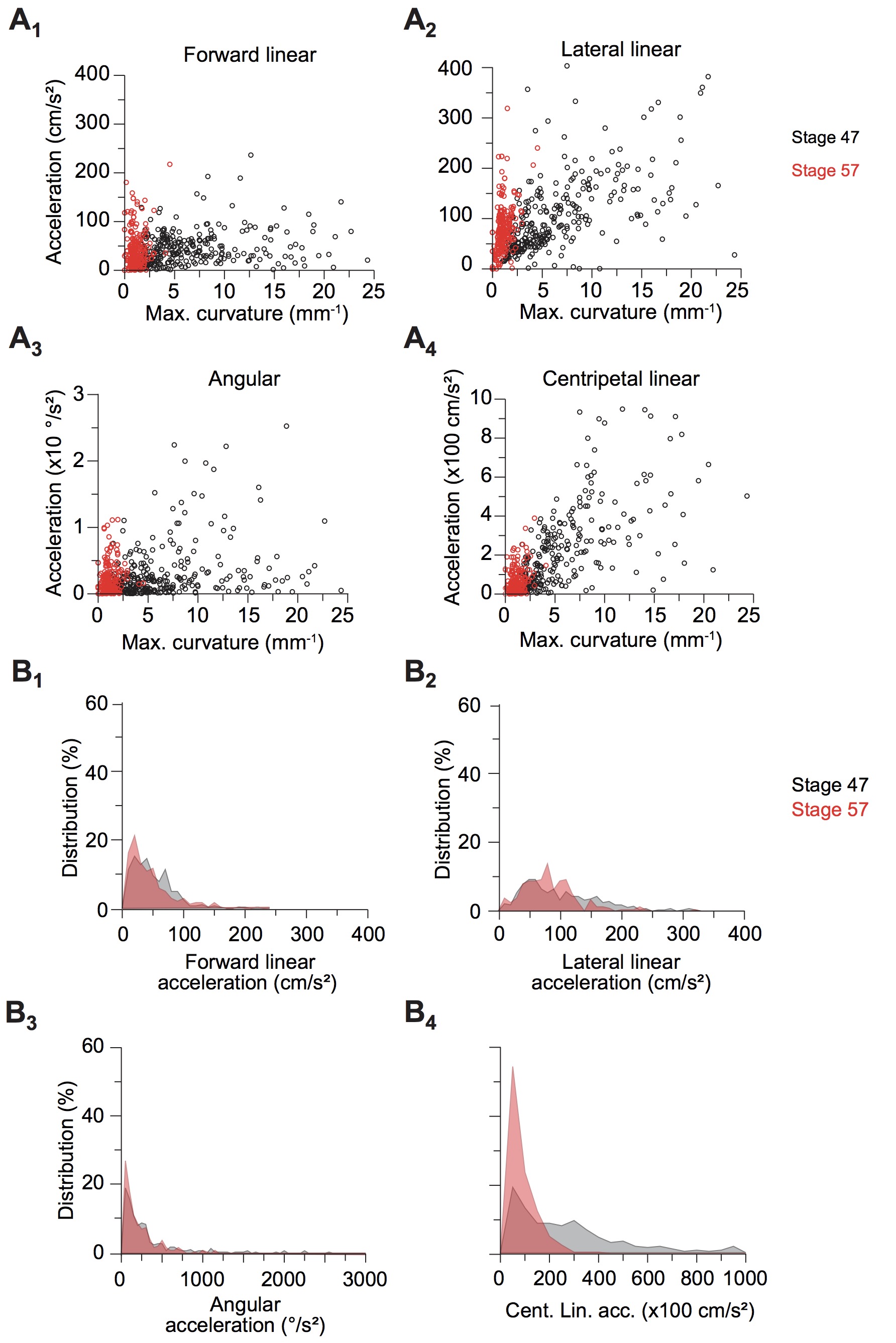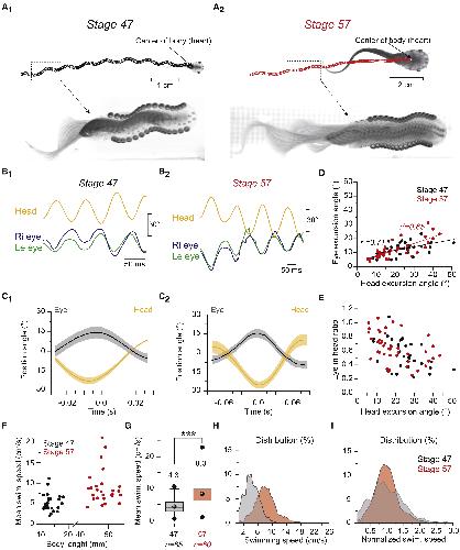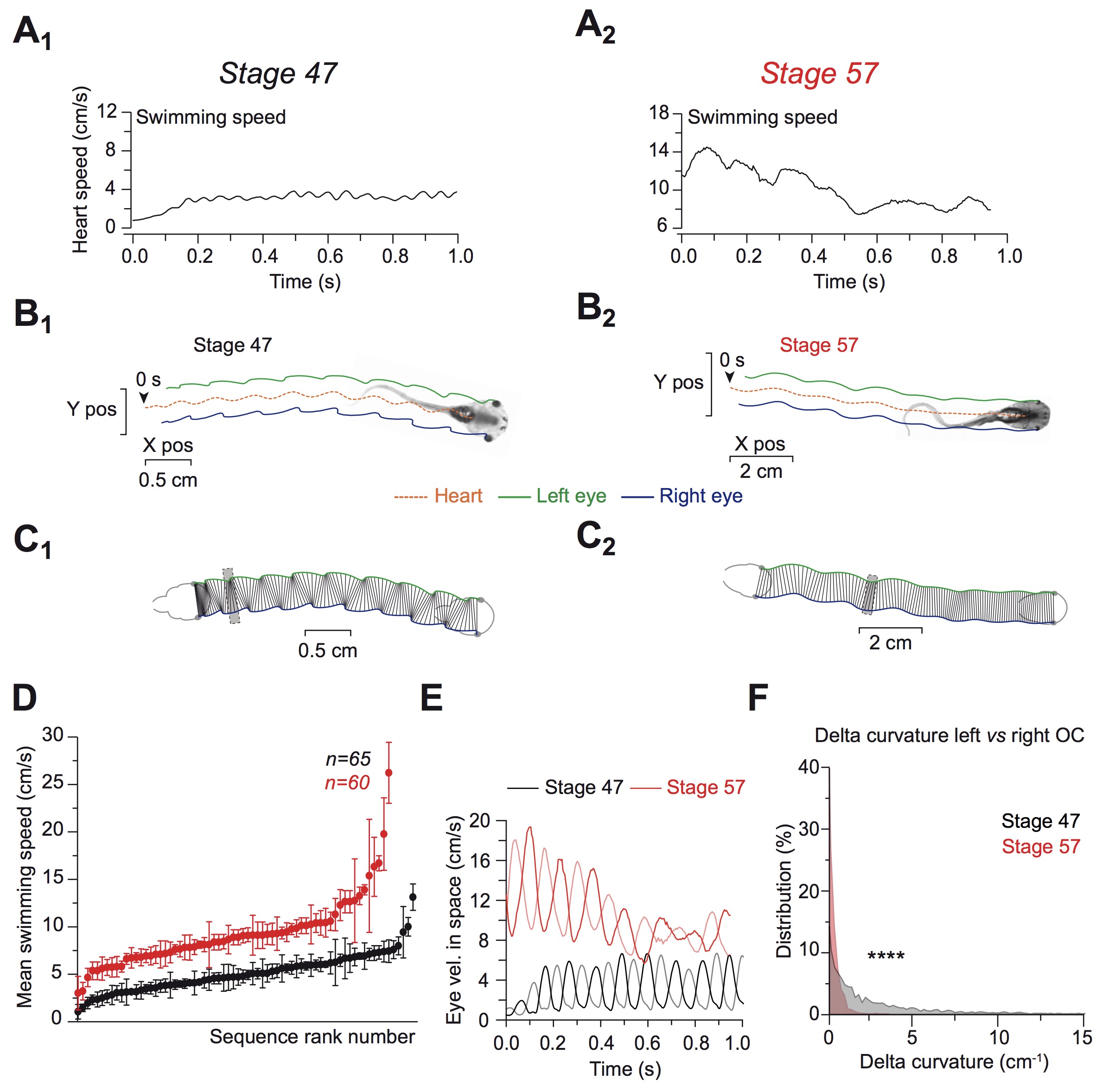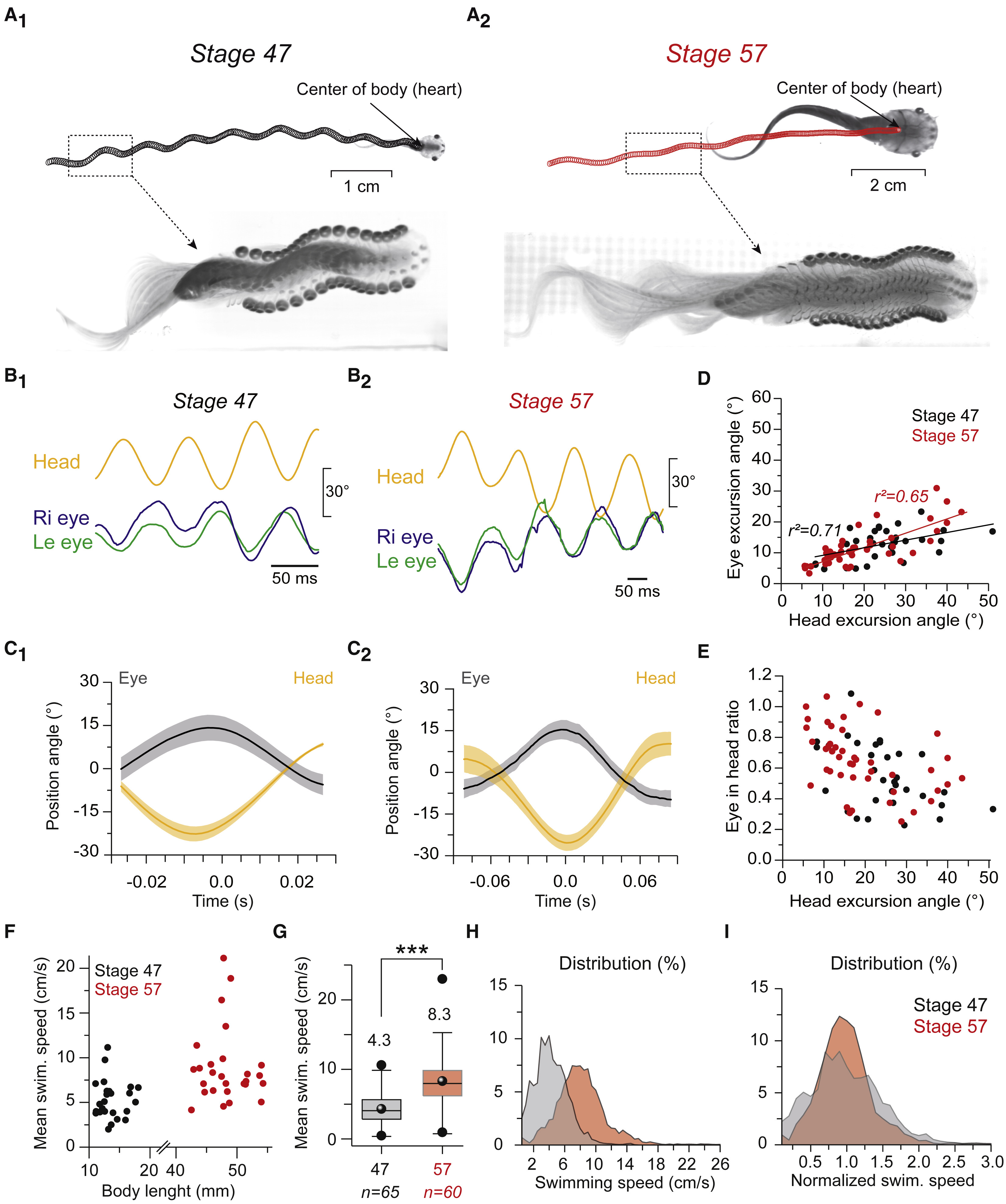 (A) Frame-by-frame motion trajectory of larval swimming at stage 47 (A1) and 57 (A2) obtained from high-speed videos.