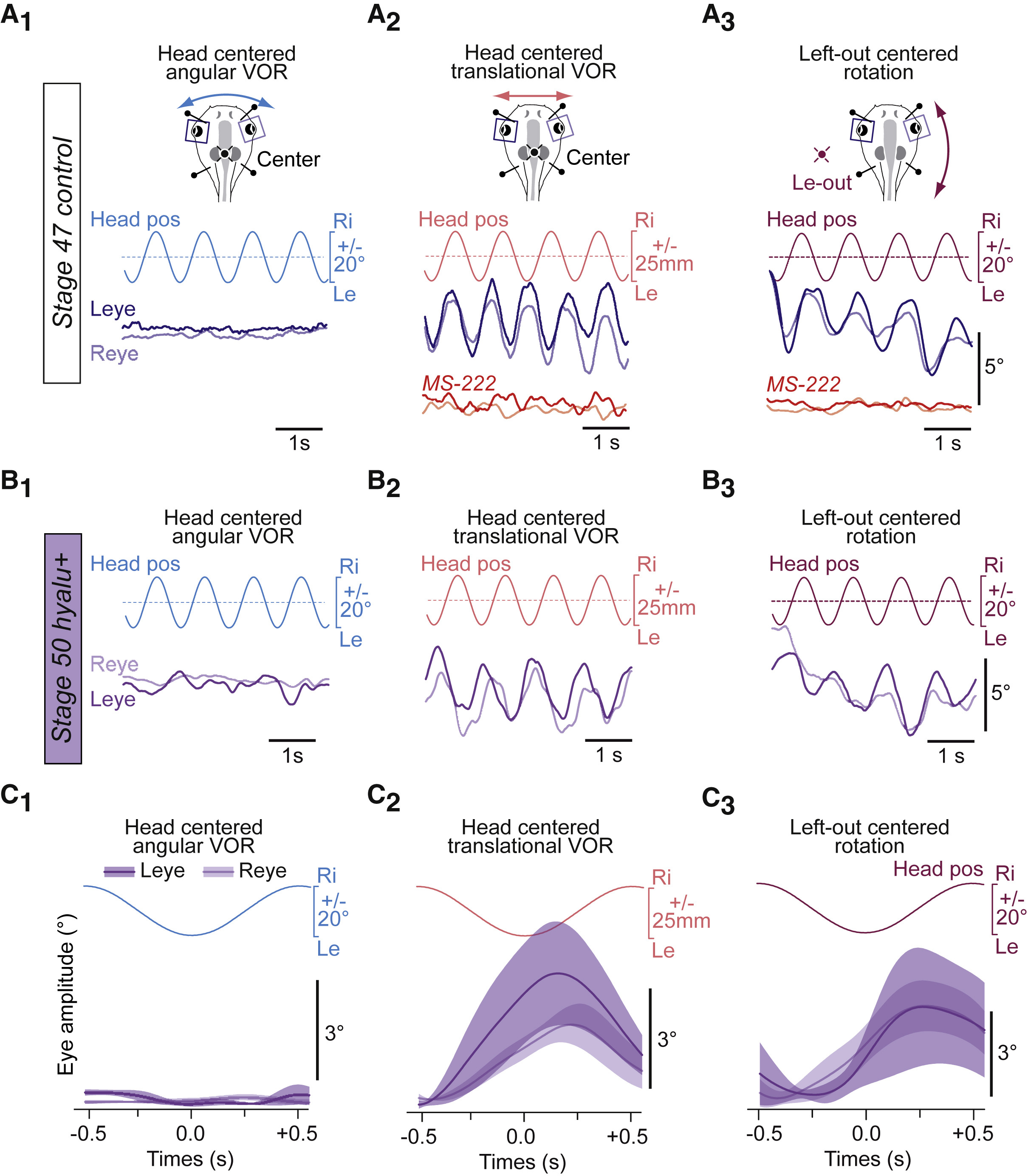 Figure 3Influence of Rotation Axis Position on Eye Movements in Tadpoles with Intact, Pharmacologically Impaired, or Semicircular Canal-Deficient Inner Ears. (A) Movement of the left (dark traces) and right (light traces) eye at stage 47 during horizontal rotation with the vertical axis in the center (A1, blue), left-right linear translation (A2, pink; see Video S3), and during off-center (left-out centered in A3; Le-out, purple; see Video S4) under control condition (blue traces) and after injection of 0.5% MS-222 into both inner ears (red traces); note that the robust conjugate compensatory eye movements during translation (A2) and off-center rotation (A3) were completely abolished by the local anesthetic (see also Figure S4).(B and C) Four successive motion cycles (B) and average over a single cycle (mean ± SEM, C) of the left (dark traces) and righteye (light traces) during horizontal rotation with the vertical axis in the center (B1 and C1, blue), left-right linear translation (B2 and C2, pink), and during off-center (B3 and C3; Le-out, purple) in a semicircular canal-deficient stage 50 tadpole (n = 5); note the absence of eye movements during centered vertical-axis rotations and their persistence during off-center rotations and translations (see also Figure S4).