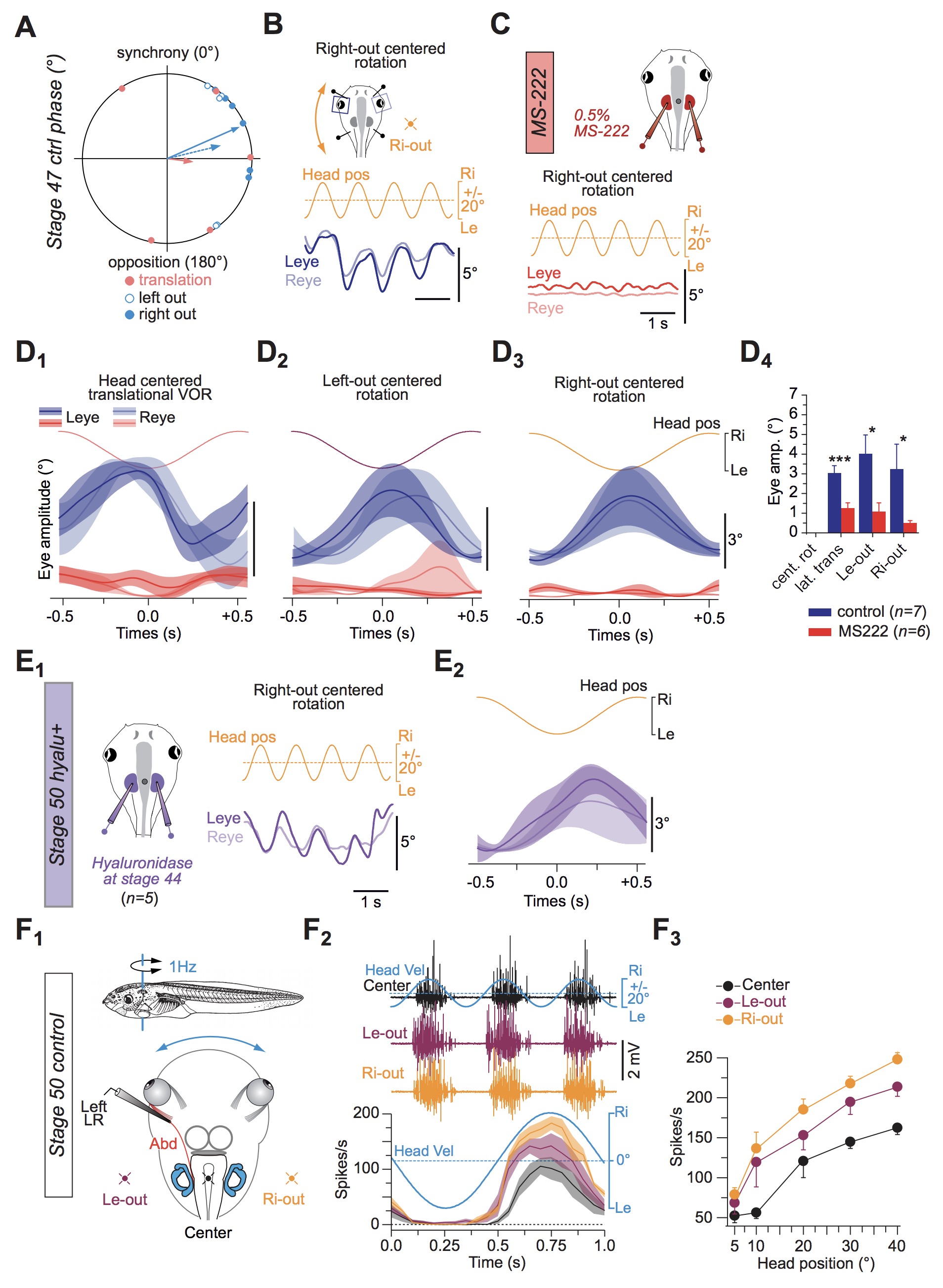 (B, C and D) Movement of the left (dark traces) and right (light traces) eye at stage 47 during horizontal rotation