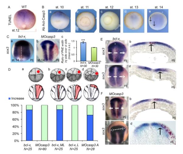 Figure 1: Endogenous apoptosis contributes to axial organizer formation independently of Caspase3 activity (A) TUNEL-staining reveals apoptosis in the axial midline. Representative TUNEL-stained wild type (wt) stage (st.) 12 Xenopus embryos. (B) Activated Caspase-3 (Act-Casp3) is not detected before stage 14 in Xenopus embryos. Representative immuno-staining against Act-Casp3 performed on st.10 to st.14 embryos. Act-Casp3 positive nuclei are shown with black arrows; st.10 to 12 ventral view dorsal up; st. 13 and 14 dorsal view anterior up. (C-F) Endogenous apoptosis affects establishment of the posterior neural plate via its activity on axial organizer signaling independently of Casp3. (C) Xenopus embryos were injected into one dorsal blastomere at the four-cell stage with mRNA encoding (a) X. laevis bcl-xl or (b) MOcasp3 together with a tracer (red) and analyzed by ISH with sox3. Representative st.14 embryos are shown. (c) Quantification graph of (a, b). (D) Xenopus embryos were injected into one dorsal blastomere at the four- (a), sixteen- (b, c) or thirty-two- (d) cells stage with mRNA encoding X. laevis bcl-xl or MOcasp3 together with a tracer (red) and analyzed by ISH with sox3. The site of injection (red dot), and the corresponding st.14 targeted territory (red area) are represented. The graph indicates the % of embryos exhibiting the (a-c) posterior, or (d) anterior, neural plate enlargement phenotype (blue). ML: medio-lateral; L: lateral; A: anterior neural plate. (E, F) Bcl-XL acts on the axial organizer cells. Embryos were injected either in the axial organizer (notochord and floor plate) or in lateral ectoderm with (E) bcl-xl or (F) MOcasp3. Representative embryos are shown dorsal view, anterior up, except (Fc) shown dorsal-anterior view. Representative transverse sections (50μm) are shown at the antero-posterior axis positions indicated with a white-dashed arrow (Eb,d; Fb,d). The black arrow indicates the limits of the injected territory. PNE: posterior neuroepithelium. Inj: injected side. White dashed lines indicate the midline. Relative normalized expression is indicated as means ± standard error (s.e.) *** p<0.001.