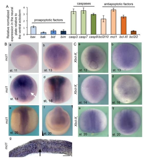 Figure 2: mcl1 expression pattern suggests a role for this protein in axial organizer development. (A) RT-qPCR analysis of apoptotic cascade mRNA in Xenopus early neurula. Analysis performed on RNA extracted from dissected neural plates, and ventral ectoderms (N=15) of X. laevis embryos at stage (st.) 14 for pro-apoptotic factors â bak, bad, bid, bim, including caspases (casp) - casp3, casp7, and casp9 and anti-apoptotic factors â bcl2l10, mcl1, bcl-xl, and bcl2l2. Expression is normalized relative to ef1α. Relative normalized expression is indicated as means ± s.e. (B) mcl1 expression pattern. ISH using a probe for mcl1 from stage 11 to stage 20 embryos; (a) ventral view, dorsal up, (b-e) dorsal view anterior up, (f) anterior view dorsal up. (g) Transverse section of (c) in the posterior part of the embryo. The scale bar stands for 200μm. The white arrow indicates the border between the ectoderm and the neuroectoderm. The black arrow indicates the notochord. (C) bcl-xl expression pattern in X. laevis gastrula and neurula. ISH using a probe for the anti-apoptotic gene bcl-xl from stage 12 to stage 20. Embryos are shown dorsal side up.
