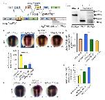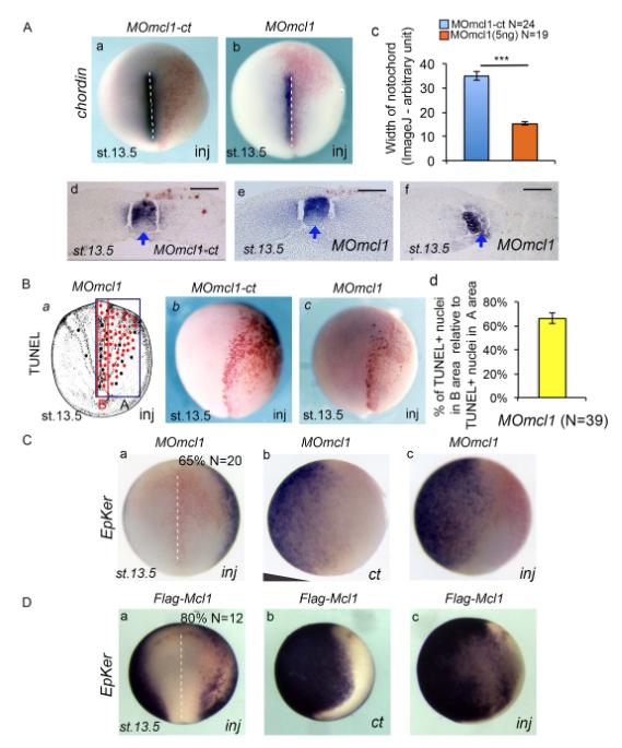 Figure 4: Mcl1 depletion specifically affects the survival of notochord cells. (A) Depletion of Mcl1 affects notochord development. ISH of stage (st.) 13.5 embryos using probes against chordin (a,b). Embryos injected (inj) with (a) MOmcl1-ct (N=24); or (b) MOmcl1 (N=19); (c) Quantification graph showing notochord width comparison in embryos injected with MOmcl1-ct or MOmcl1. (d-f) Histological vibratome sections of respectively (d) MOmcl1-ct and (e,f) MOmcl1. Blue arrow indicates the notochord. Scale bar stands for 200μm. (B) Quantification of midline apoptosis induced by Mcl1 depletion. TUNEL staining was performed at st.13.5. (a) Schematic representation of TUNEL quantification: red dots represent injected cells; black dots represent TUNEL positive cells. All apoptotic cells were counted in (A) the black rectangle considered the total injected area, and (B) the red rectangle considered the midline area. (b, c) Representative TUNEL staining on stage 13.5 embryos injected with (b) MOmcl1-ct; or (c) MOmcl1 (N=39). (d) Quantification of B. (C, D) The decrease in neural plate width upon depletion of Mcl1 is mirrored by the increase in ectoderm territory. ISH against epidermal keratin (EpKer). Representative stage 13.5 embryo injected with (C) MOmcl1-1; (D) flag-mcl1; (a) dorsal view anterior up; (b) View of the non-injected side: lateral view, anterior up, dorsal side right; (c) View of the injected side: lateral view, anterior up, dorsal side