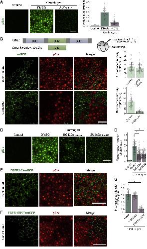 (C) FGFR inhibitors BGJ398 (50 μM) and SU5402 (50 μM) reduced the Erk2 activation. The experiments were conducted at the same time with those of Figure 4A. Scale bar: 100 μm.
