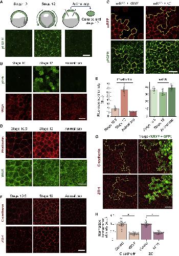 (C) Embryos centrifuged at 450 à g for 10 min, and control embryos were stained with fluorescent phalloidin and with anti-C-cadherin and anti-ZO-1 antibodies. Scale bar: 50 μm.
