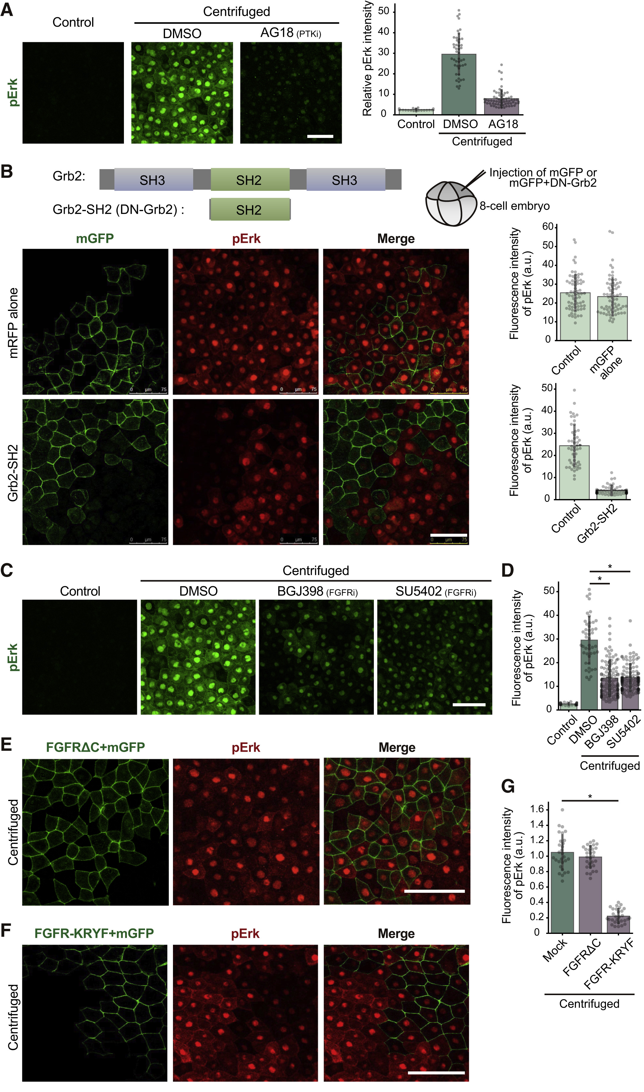 (D) mRNAs encoding FGFR-KRYF or Grb2-SH2 were co-injected with GFP mRNA at the four-cell stage. Embryos were centrifuged at 450 à g for 10 min and stained with indicated antibodies or phalloidin. Scale bar: 50 μm.