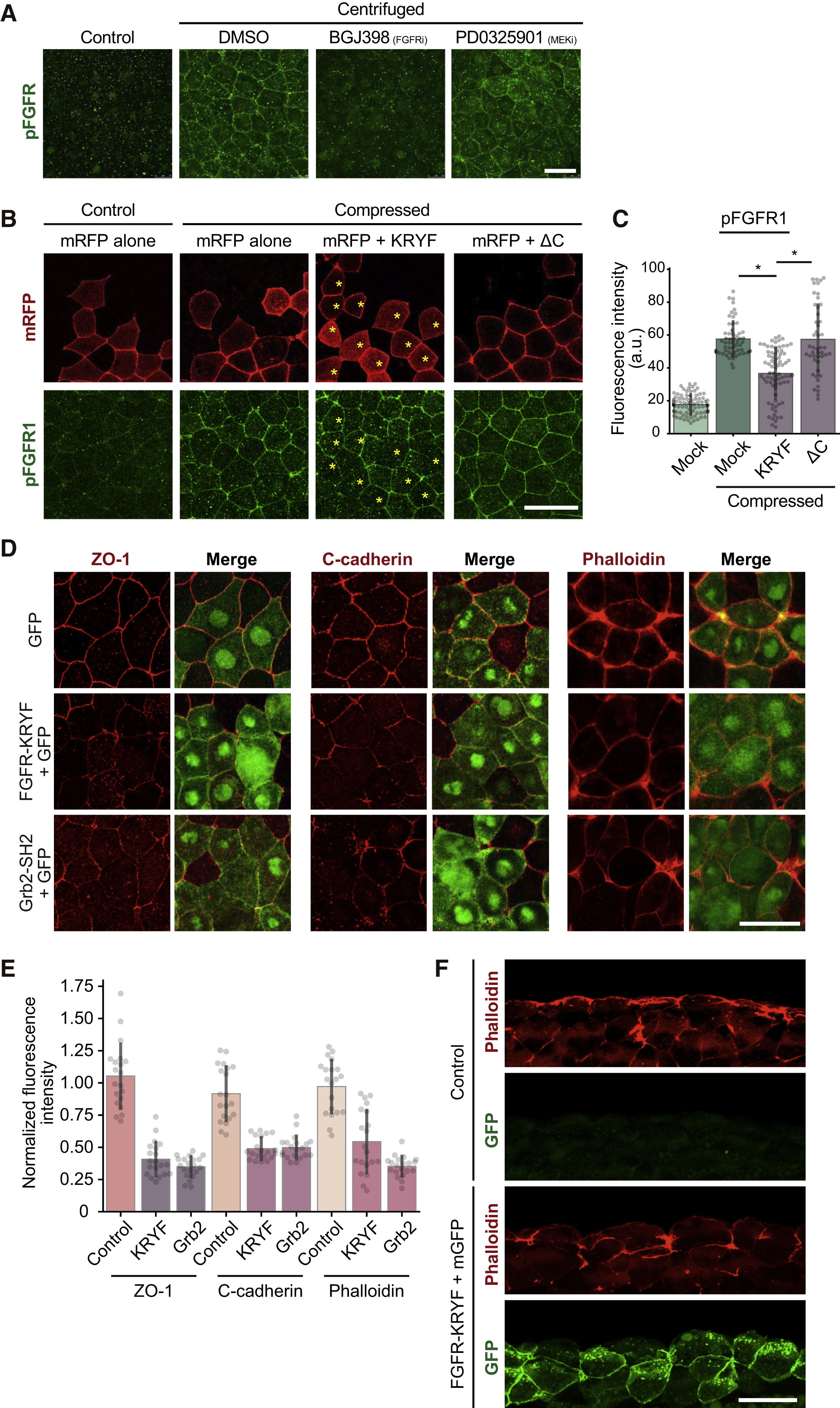 (B) mRFP mRNA with or without FGFR1 mutant mRNAs, FGFR-KRYF and ÎC, were injected into embryos at the four-cell stage. The embryos were compressed (0.3 mm, 5 min) at the early gastrula stage and immunostained with anti-pFGFR1 antibodies. The asterisks indicate KRYF-expressing cells. âp < 0.01. Scale bar: 50 μm.