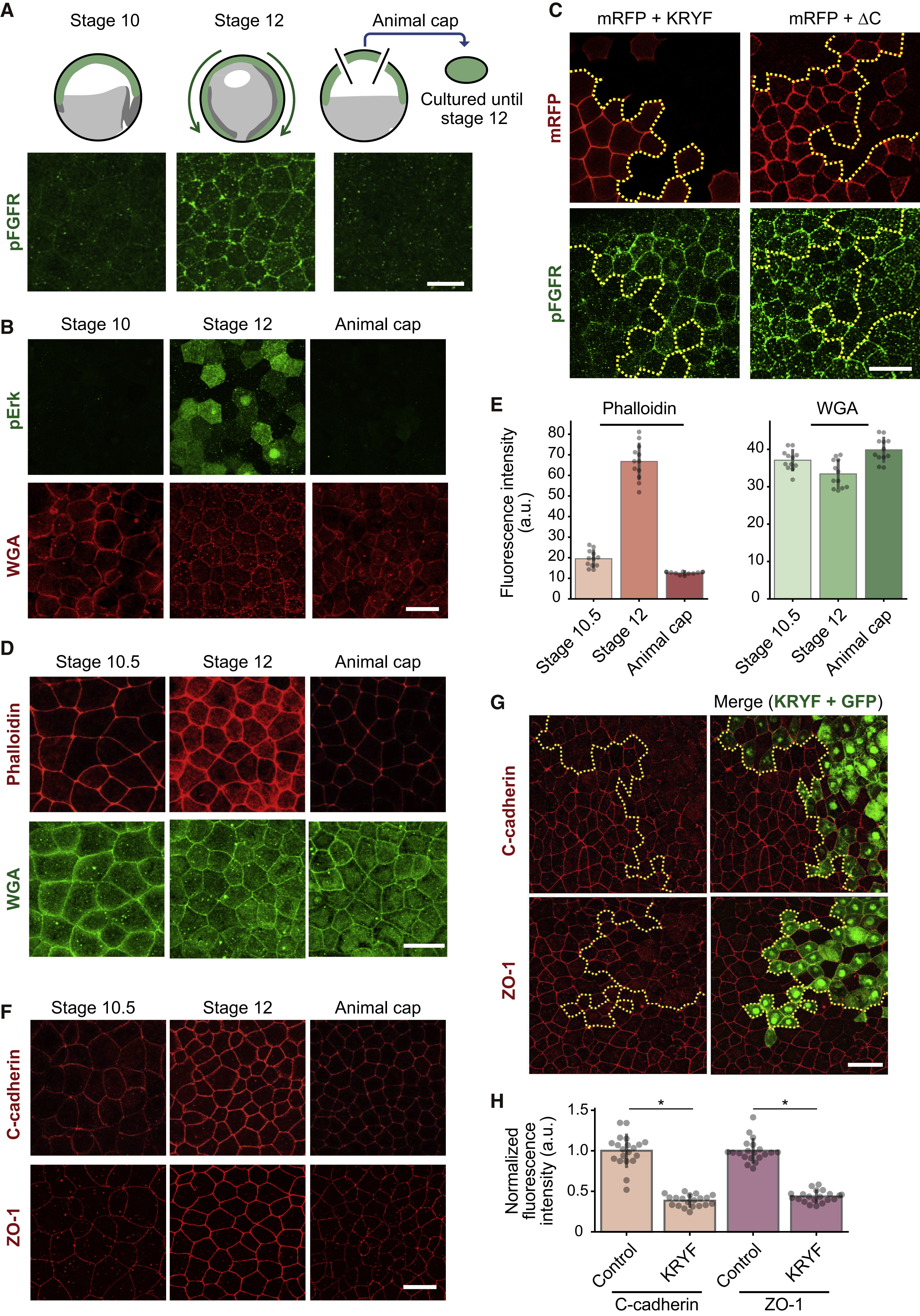 (G) mRNAs encoding FGFR-KRYF and GFP were coinjected in one blastomere of four-cell embryos. At st. 12, embryos were fixed and immunostained with anti-C-cadherin or ZO-1 antibodies. Scale bar: 50 μm.