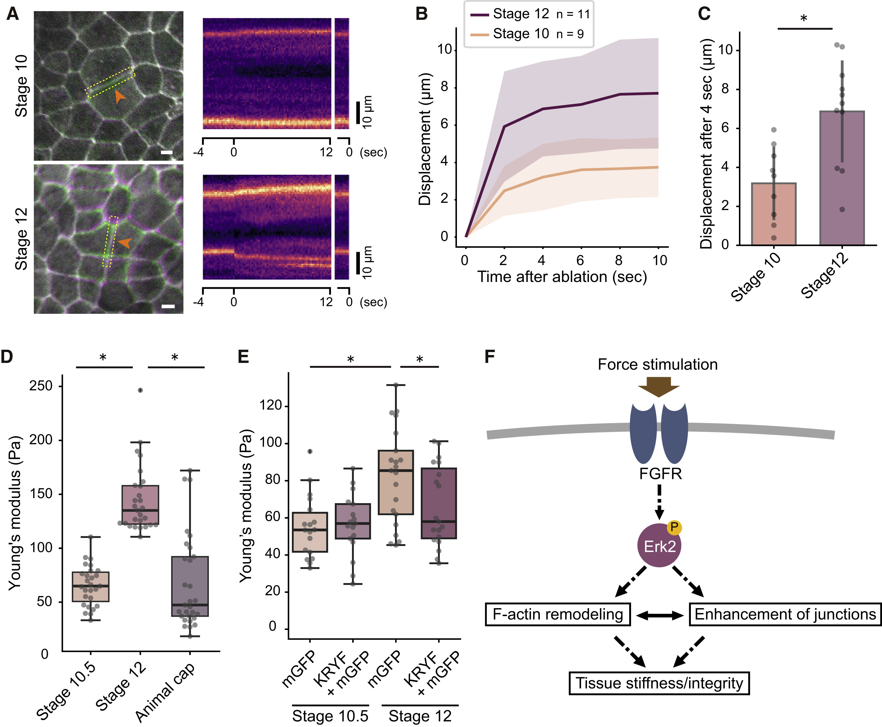 (F) Graphical summary. Our results demonstrate that the application of mechanical force to ectodermal cells in Xenopus embryos activates FGFR in a ligand-independent manner, subsequently activating the Erk2 signaling pathway. This mechanotransduction induces F-actin remodeling and enhancement of cell junctions, which in turn regulate tissue stiffness and integrity.