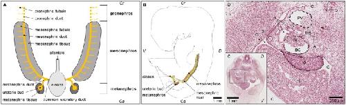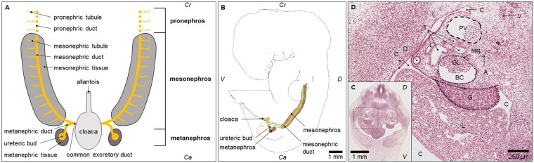 Fig. 1. Organization of kidney development. A) Diagram illustrating the three sets of excretory structures as supposed to be present in a human embryo during the fifth week (about 32 days, Carnegie stage 14) (after Moore 1988). Cr, cranial; Ca, caudal. B) Reconstruction of the urogenital system of a stage 16 human embryo specimen 6517 (37–42 days), including meso- and metanephros and their ducts (de Bakker et al. 2016). Cr, cranial; Ca, caudal; D, dorsal; V, ventral. C) Section through the mesonephric region of a stage 17 human embryo specimen 6521 (42–44 days). D, dorsal; V, ventral. D) Enlarged part of the section in C. A, arteriole; BC, Bowman’s capsule; C, coelom; D, mesonephric duct; G, gonad; GL, glomerulus; L, liver; MB, Malpighian body; PV, postcardinal vein; T, mesonephric tubules; V, vein.