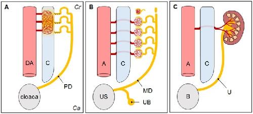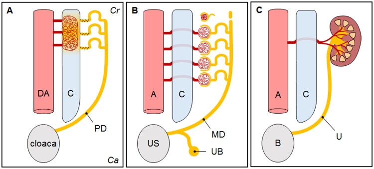 Fig. 2. Schematic drawings of pro-, meso-, and metanephros. A) Schematic drawing of the non-integrated nephron of a pronephros in frogs. The glomus, a single glomerular unit that is formed over two to three body segments and later becomes more compact, is supplied by arterial sprouts from the dorsal aorta and filters wastes directly in the fluid of the coelomic cavity (Gerth et al. 2005). The glomus is not integrated in the tubules but it lies in the immediate vicinity of them, so there is almost no space between the glomus and nephrostomes. These ciliated nephrostomes collect the coelomic fluid and the primitive urine will be collected through the pronephric tubules via the pronephric duct into the cloaca. See also Fig. 3A. B) Schematic drawing of the integrated nephrons of a mesonephros. The glomeruli are supplied by arterial sprouts from the aorta that pass behind the coelom and filter wastes into Bowman’s cavities. The glomeruli are therefore integrated in the tubules. The collected wastes are transported through the mesonephric tubules toward the mesonephric duct and collected in the urogenital sinus. See also Fig. 3B. The ureteric bud which initiates metanephric development and will become the ureter is an outgrowth of the mesonephric duct. The cranial-most metanephric nephrons degenerate over time. Note that these degenerated nephrons have often been wrongly described as pronephric. C) Schematic drawing of a metanephros and its supplying renal artery are situated retro-peritoneal, so dorsal of the coelom. The metanephric nephron with its Bowman’s space and extensive tubule is firmly embedded within the renal cortex and renal pyramids (lighter triangles). Urine is collected in the renal pelvis and transported through the ureter toward the bladder. A, aorta; B, bladder; C, coelom; Ca, caudal; Cr, cranial; DA, dorsal aorta; PD, pronephric duct; US, urogenital sinus; U, ureter; UB, ureteric bud; MD, mesonephric duct.