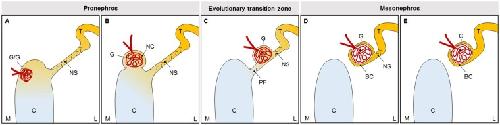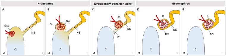 Fig. 4. Different manifestations of pronephric and mesonephric nephrons. The non-integrated nephrons in A and B are purely pronephric as the external glomerulus or glomus hangs freely in the coelom (A) or nephrocoel (B). The integrated nephrons in D and E are typical mesonephric because the connection with the coelom is lost and the internal glomerulus is enclosed by Bowman’s capule. The nephron in C, which includes both a peritoneal funnel (PF) and a nephrostome (NS), has been regarded by Vize as mesonephric (Vize et al. 2003). However, to avoid ambiguity we suggest to refer to these nephrons as intermediate nephrons. The region in which these nephrons are found has been called the evolutionary transition zone (ETZ) by multiple authors (Fraser 1920; Davies 1950; Sedgwick 1881; Renson 1883; Mihalkovics 1885; Hiruma and Nakamura 2003), since the glomerulus is still in contact with the coelom (a typical pronephric feature) and the PF has been regarded both pronephric (Fraser 1950; Davies 1951; Hamilton et al. 1972) as mesonephric (Vize et al. 2003). This intermediate type of nephron might actually represent the gradual evolutionary change from pronephros to mesonephros (Wiedersheim 1890; Davies 1950; Hiruma and Nakamura 2003). C, coelom; G, glomerulus; G/G, glomerulus/glomus; L, lateral; M, medial; NS, ciliated nephrostome, which links the coelom or nephrocoel with the proximal tubule; PF, ciliated peritoneal funnel, which links the coelom to the encapsulated glomerulus (primitive Bowman’s capsule); T, tubule.