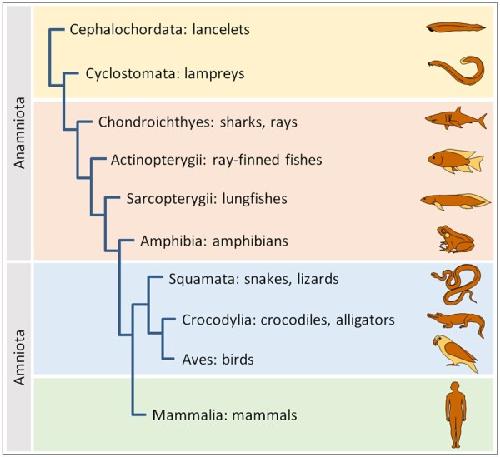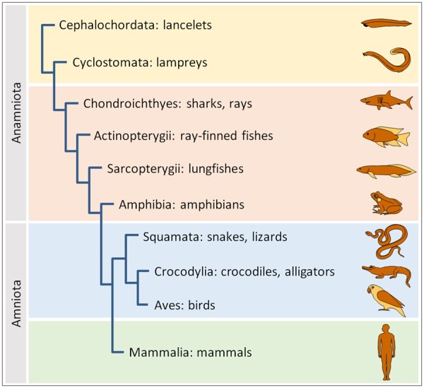 Fig. 6. Overview of the appearance of a pronephros in animal species presented as evolutionary cladogram. For details and references, see Supplementary Table S1. (Cephalochordata and Cyclostomata): pronephros functioning as adult kidney. (Chondroichthyes, Actinopterygii, Sarcopterygii, and Amphibia): pronephros functioning in the larval stage. However, the pronephros seems to be absent in those Elasmobranchii that have no larval stage, and in the Amniota which develop within the body of the parent (Fraser 1950). (Squamata, Crocodylia, and Aves): Although a pronephros has been described in embryos of some of these animals (Supplementary Table S1), the term pronephros should be used with much restraint (Fraser 1950). Further research in these species is needed to clarify the contradictions that appeared in the literature as a result of the use of different definitions. (Mammals): no pronephros is present.