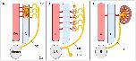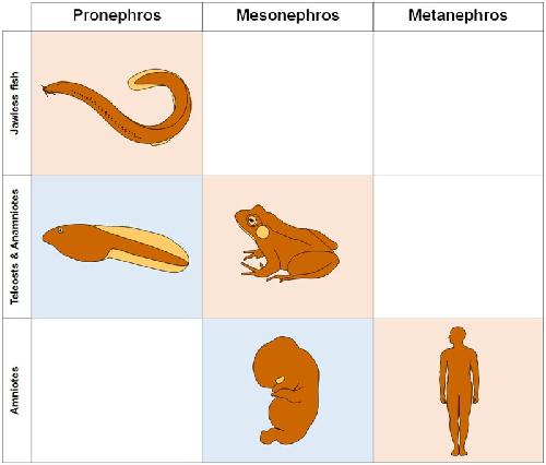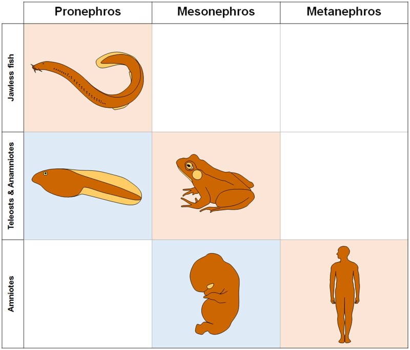 Fig. 7. General concept for renal evolution. Vertical columns: different kidney forms (i.e., pro-, meso-, and metanephros). Horizontal rows: different classes of species. In most jawless fish, like Amphioxus and hagfish, the pronephros remains functional through adulthood, often alongside a functional mesonephros. Larvae of teleosts and anamnia (e.g., tadpoles) generally pass a pronephric stage, while adult specimens (e.g., frogs) use a mesonephros for secretion. Embryos of amniotes (e.g., humans) do not pass a pronephric stage, but do use the mesonephros during the embryonic phase and the metanephros through fetal development, in childhood and in adulthood. The used kidney form thus gradually shifts from simple pronephric kidney as used by adult jawless fish, via the intermediate mesonephric kidney in more basal vertebrates toward the intricate metanephric kidney as used by more advanced vertebrates.