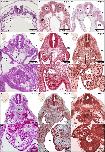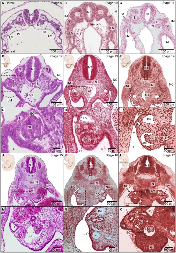 Fig. 5. Histological features of human nephrogenic development. A) Transverse section through the caudal region of a stage 9 (26–30 days) human embryo specimen H712. The intermediate mesoderm (IM) is still hard to discern from somite (paraxial mesoderm) and lateral plate mesoderm (LM) B) Transverse section through the caudal region of a stage 10 (21–23 days) human embryo specimen 5074. The intermediate mesoderm is recognizable as a clump of undifferentiated mesenchymal cells. C) Transverse section through the caudal region of a stage 11 (23–26 days) human embryo specimen 6344. The intermediate mesoderm is still undifferentiated. D) Transverse section through the caudal region of a stage 12 (26–30 days) human embryo specimen 8943. The nephrogenic cord (NC) is now present. E) Transverse section through the mesonephric region of a stage 13 (28–32 days) human embryo specimen 836. Fig. 5 F) Transverse section through the mesonephric region of a stage 14 (31–35 days) human embryo specimen 6502. G) Enlarged part of the section in D. A very primitive glomerulus is recognizable, surrounded by a primitive Bowmans capsule. Bowmans capsule is not in contact with the coelom, also not on the adjacent and subsequent sections. The mesonephric duct is not yet lumenized at this stage. H) Enlarged part of the section in E. The glomerulus and Bowman’s capsule still appear in a primitive stage. The mesonephric duct becomes lumenized. I) Enlarged part of the section in F. The definitive morphology of the mesonephros is recognizable. The glomerulus and Bowman’s capsule together constitute the Malpighian body. The mesonephric duct and tubule are well defined and lumenized. At this stage the mesonephros can be assumed to be in function. Between stage 14 and stage 17 (L, O) the histological features of the mesonephros remain constant. J) Transverse section through the mesonephric region of a stage 15 (35–38 days) human embryo specimen 721. K) Transverse section through the mesonephric region of a stage 16 (37–42 days) human embryo specimen 6517. L) Transverse section through the mesonephric region of a stage 17 (42–44 days) human embryo specimen 6520. M) Enlarged part of the section in J. N) Enlarged part of the section in K. Two Bowman's capsules are present in this section. Also note the clear presence of a gonadal ridge. O) Enlarged part of the section in L. Two glomeruli can be appreciated in this section. A, arteriole; AO, aorta; BC, Bowman’s capsule; C, coelom; D, mesonephric duct; G, gonadal ridge; GL, glomerulus; IM, intermediate mesoderm; LM, lateral plate mesoderm; N, notochordal plate (CS 9, 10, 11) or notochord (CS 12, 13, 14); NC, nephrogenic cord; NG, neural groove; NT, neural tube; PV, postcardinal vein; S, somite; T, mesonephric tubule. We encourage the readers to study the histological sections of all presented stages. All stacks of sections can be downloaded from http://www.3datlasofhumanembryology.com.