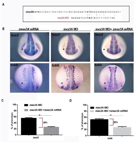 Zebrafish mex3A sequence and the mex3A-Mo used in the functional analysis. The morpholino is not able to bind efficiently the zebrafish sequence. The pairing between mex3A-Mo and the zebrafish mex3A sequence if affected by 18 mismatches (B) The overexpression of 800pg of zebrafish mex3A reproduced the overexpression phenotype observed with the Xenopus mex3A mRNA (sox2 phenotype 52%, n=82; tubb phenotype 47%, n=78). In the rescue experiments we injected 12 ng of mex3A-MO and 500 pg of zebrafish mex3A. (C, D) The rescue has been calculated on the percentage of embryos in which the correct expression of Sox2 and tubb was restored. (Sox2 n= 122; tubb n=116); error bars indicate standard error of the means (s.e.m); ** pâ¤0,01.