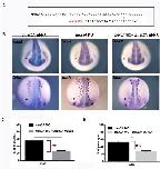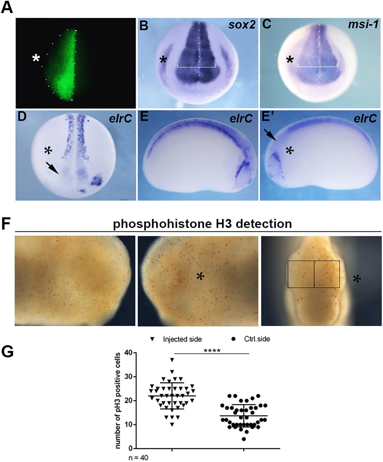 Figure 2. (A) Embryos injected with gfp (250 pg) and mex3A (500 pg) mRNA in one dorsal blastomere at the four-cells stage showing fluorescence only in the neural plate at neurula stage were cultured till different stages of development for WISH analysis. In each panel the asterisk (*) indicates the injected side of the embryo. (B,C) mRNA distribution of sox2 and msi-1 (sox2 phenotype 54%, n = 116; msi-1 phenotype 50%, n = 80) in mex3A overexpressing embryos. The arrow in (D) showed the lack of elrC expression in the anterior neural plate. (DâEâ²) mRNA distribution of elrC at 18 (phenotype 54%, n = 114, D) and at 23 (phenotype 57%, n = 70, E,Eâ²) stages in mex3A overexpressing embryos. The arrow in (Eâ²) shows the lack of neurons in the anterior neural tube. (F,G) pH3 positive cells were counted in the areas defined by the black rectangles. Statistical evaluation of the data is shown (n = 40). Abbreviations: n total number of processed embryos; error bars indicate standard error of the means (SEM); ***p ⤠0.001.