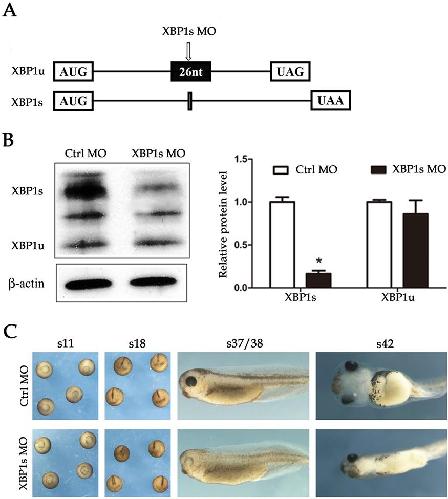 XBP1 knockdown inhibited embryonic development (A) Schematic diagram of the XBP1s MO mechanism of action. (B) XBP1s knockdown upon injection of 50 ng MO in the sputum stage (stage 42). Western blot analysis showed the knockdown efficiency. *P<0.05, n=3. (C) Effects of XBP1 knockdown on embryonic development in different stages.