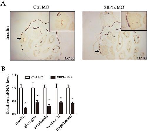 Effects of XBP1s knockdown on the development of pancreatic endocrine and exocrine cells (A) Immunohistochemical detection of the changes of the expression level of insulin after XBP1s knockdown. (B) qPCR was used to detect the expressions of pancreatic marker genes at stage 42 after XBP1s knockdown compared with the control group. *P<0.05, **P<0.01, n=9.