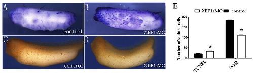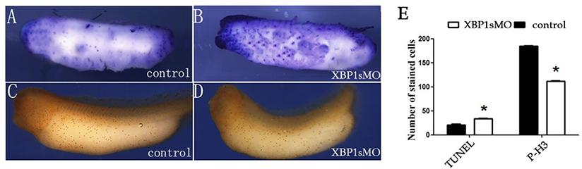 Effect of XBP1s knockdown on embryonic cell proliferation and apoptosis (A,B) TUNEL staining of the whole embryos in the control group (A) and XBP1 knockdown group (B) (blue, punctate, apoptotic cells). (C,D) pH3 staining of whole embryos in the control group (C) and XBP1 knockdown group (D) (red, punctate, proliferating cells). (E) Quantitative representation of the TUNEL and pH3 staining. *P<0.05.