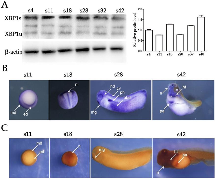 XBP1s expression in Xenopus laevis during embryonic development (A) Western blot analysis was used to detect XBP1s expression in different stages of X. laevis embryonic development (stage 4: cleavage stage; stage 11: gut stage; stage 18: neuroblast stage; stage 28 and stage 32: tailbud stage; stage 42: sputum stage). (B) Whole-mount in situ hybridization was used to detect the spatial expression of XBP1 mRNA. (C) Immunostaining was used to detect the spatial expression of XBP1 protein (md: mesoderm; ed: ectoderm; n: nerve; hd: head; cv: main vein; ph: anteriorkidney; mg: mucous gland; abd: abdomen; ht: heart; pa: pancreas).