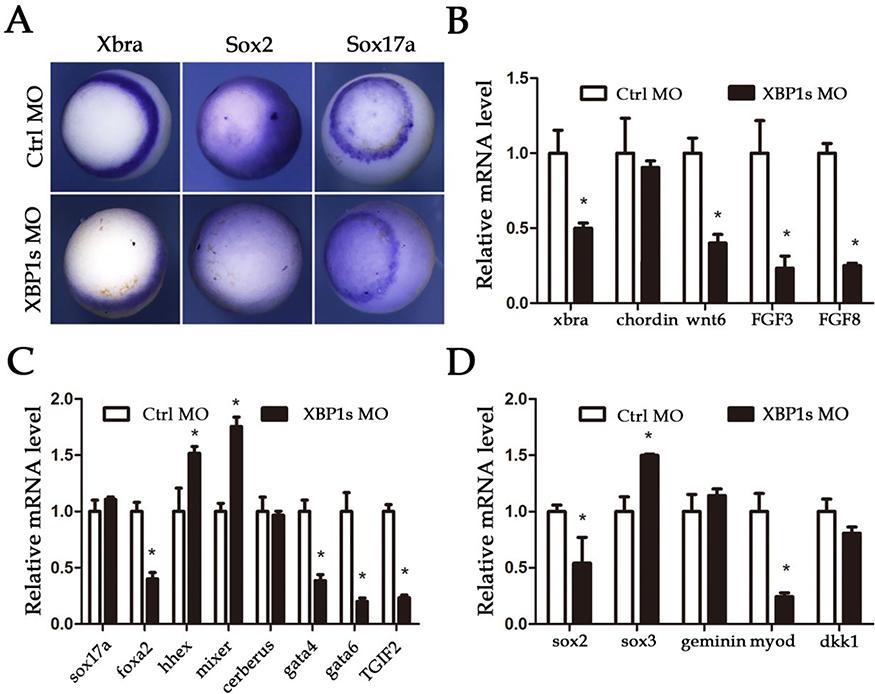 Effects of XBP1s knockdown on the germ layer formation (A) Whole-mount in situ hybridization was used to detect the changes in the germ layers at stage 11 after XBP1s knockdown. (BD) qPCR detection of the expressions of germ layer markers with XBP1s knockdown. *P<0.05, n=9.